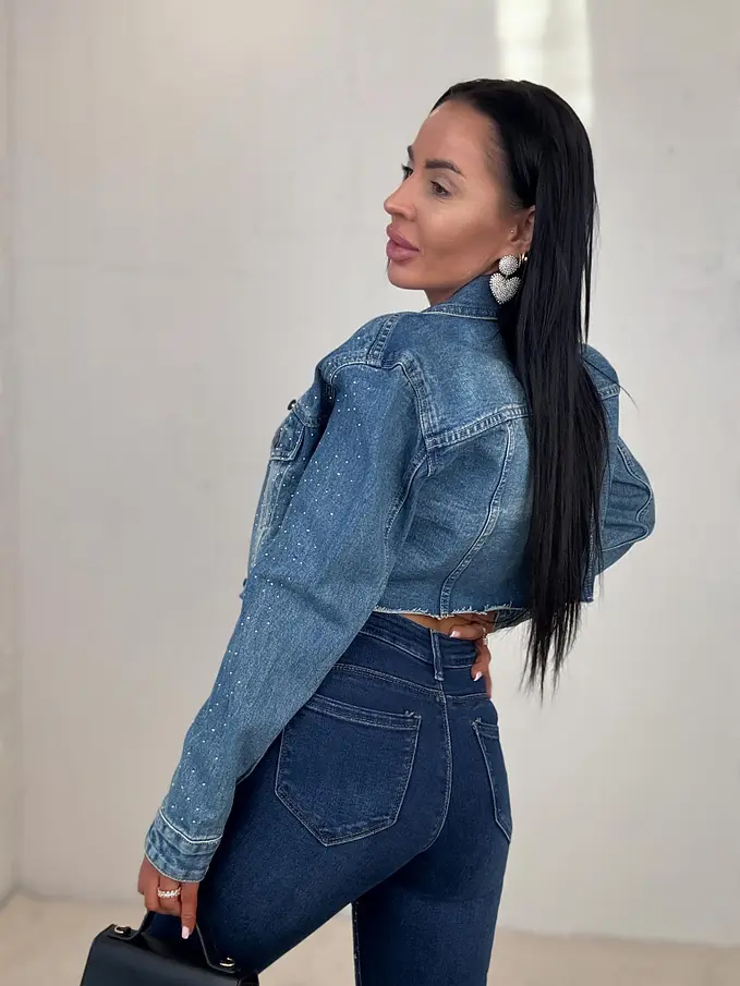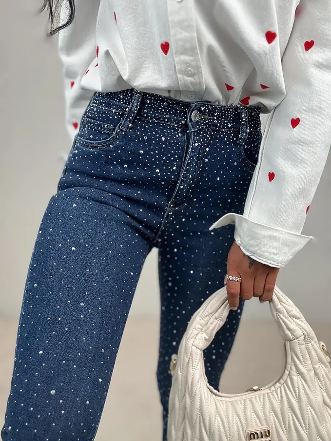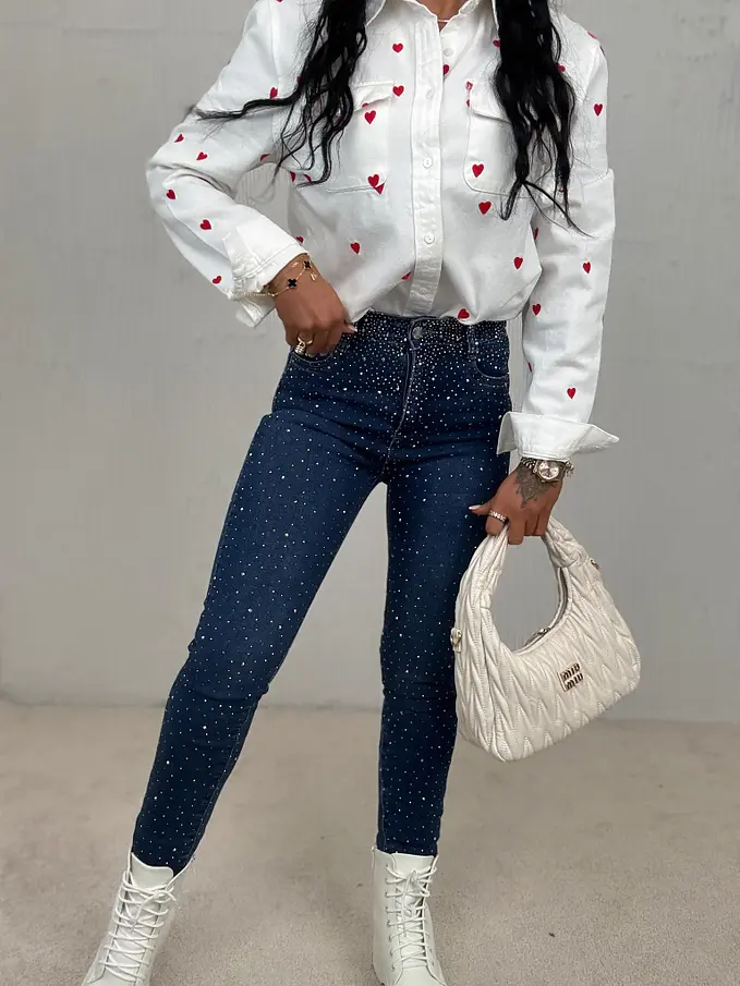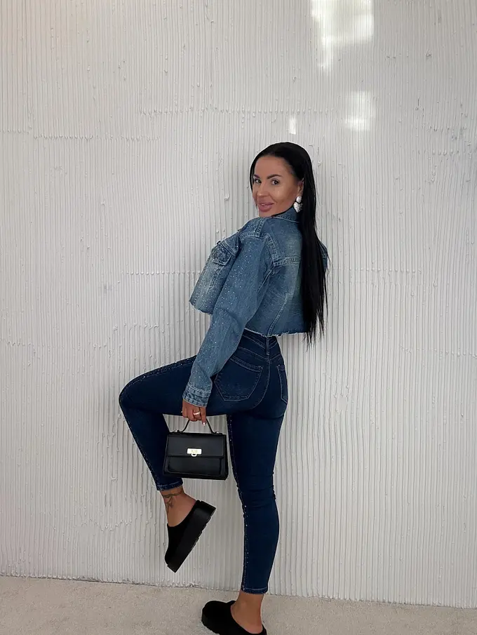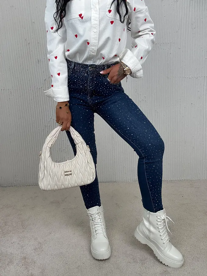 Prémium minőség. Az anyag csak minimálisan rugalmas. Magas derék. Kövekkel díszített. A gomb ezüst színű.