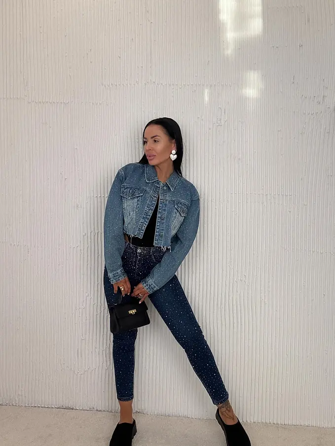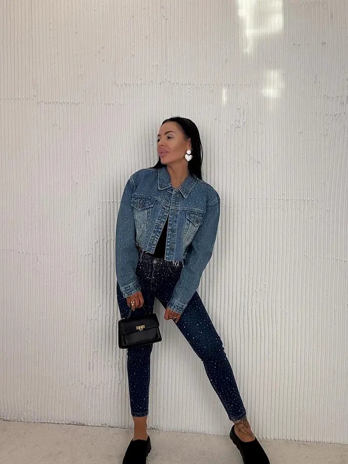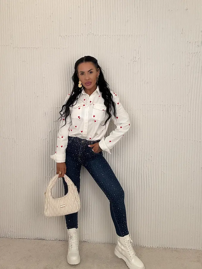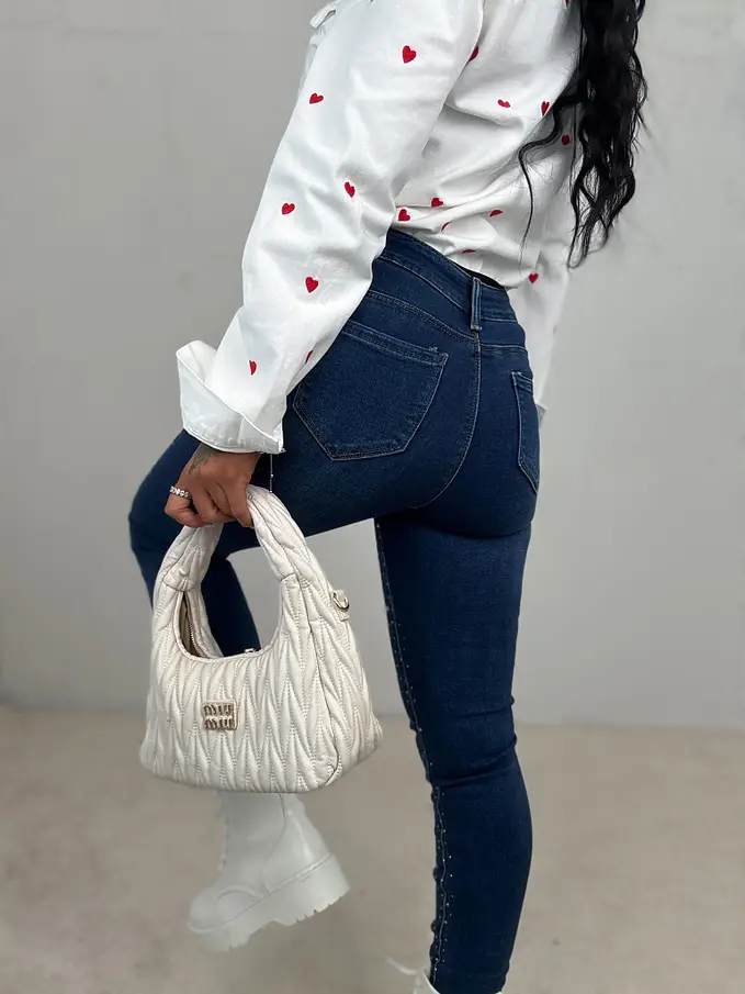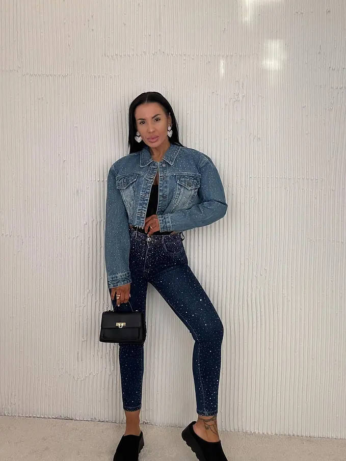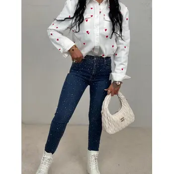 Prémium minőség. Az anyag csak minimálisan rugalmas. Magas derék. Kövekkel díszített. A gomb ezüst színű.