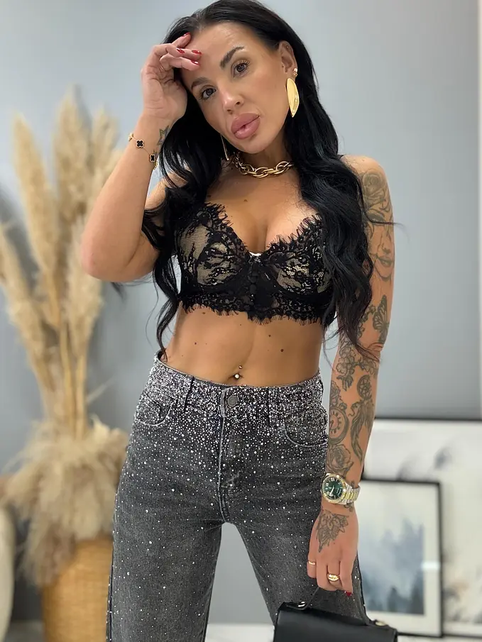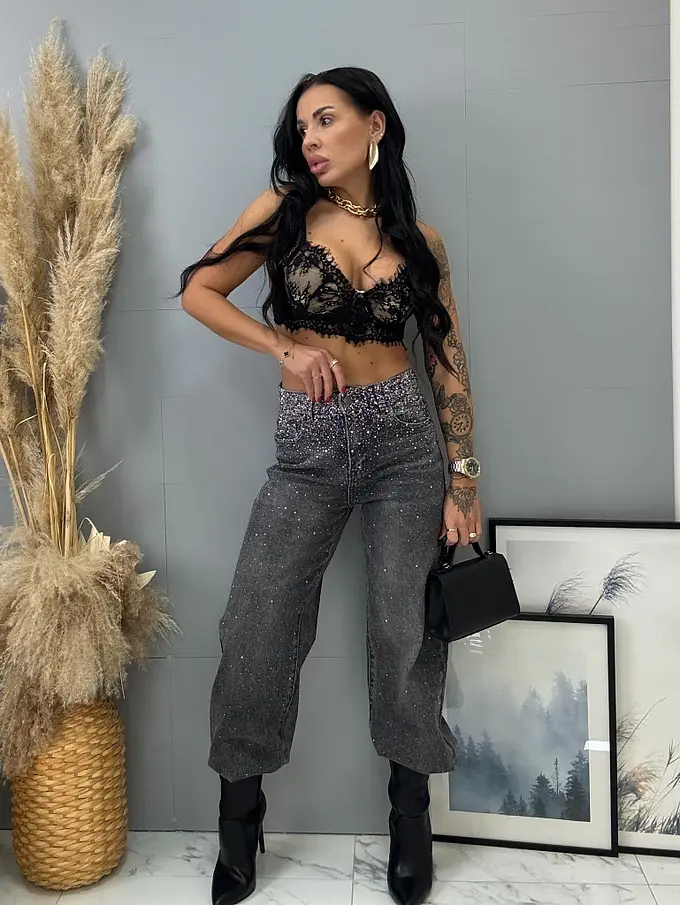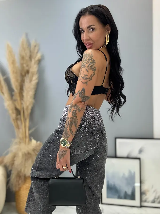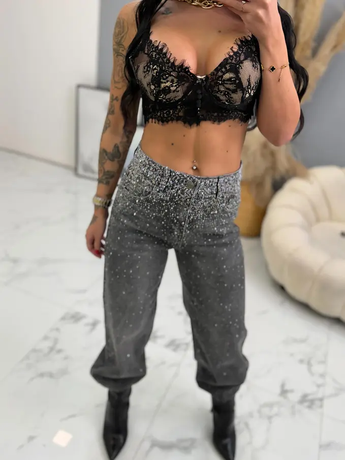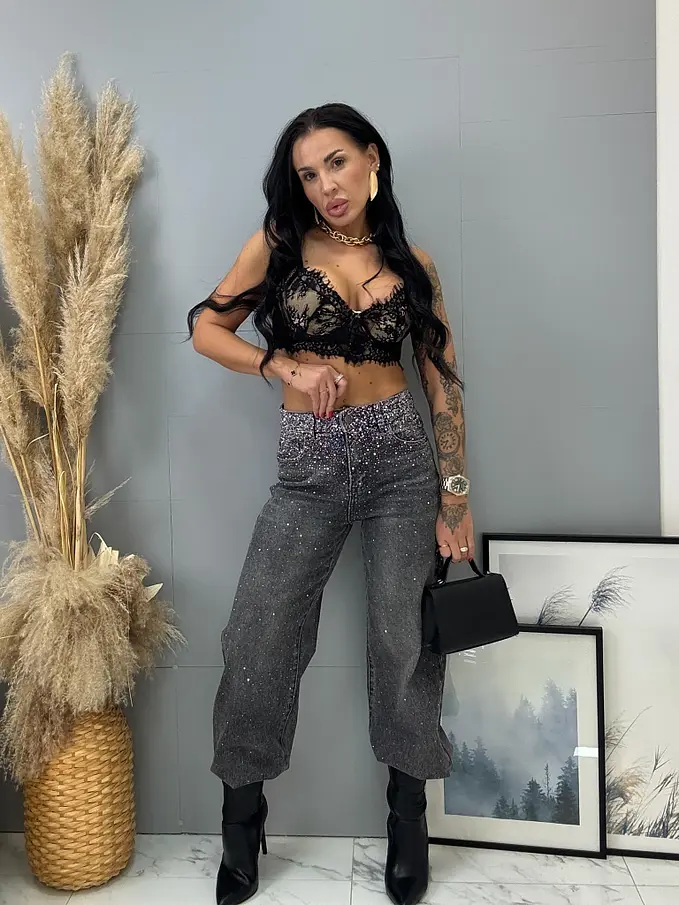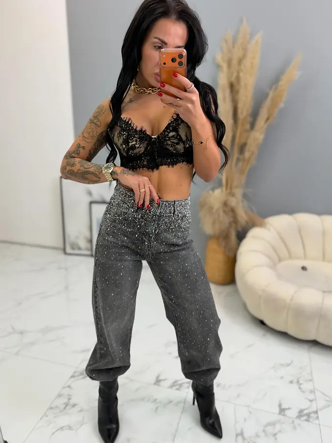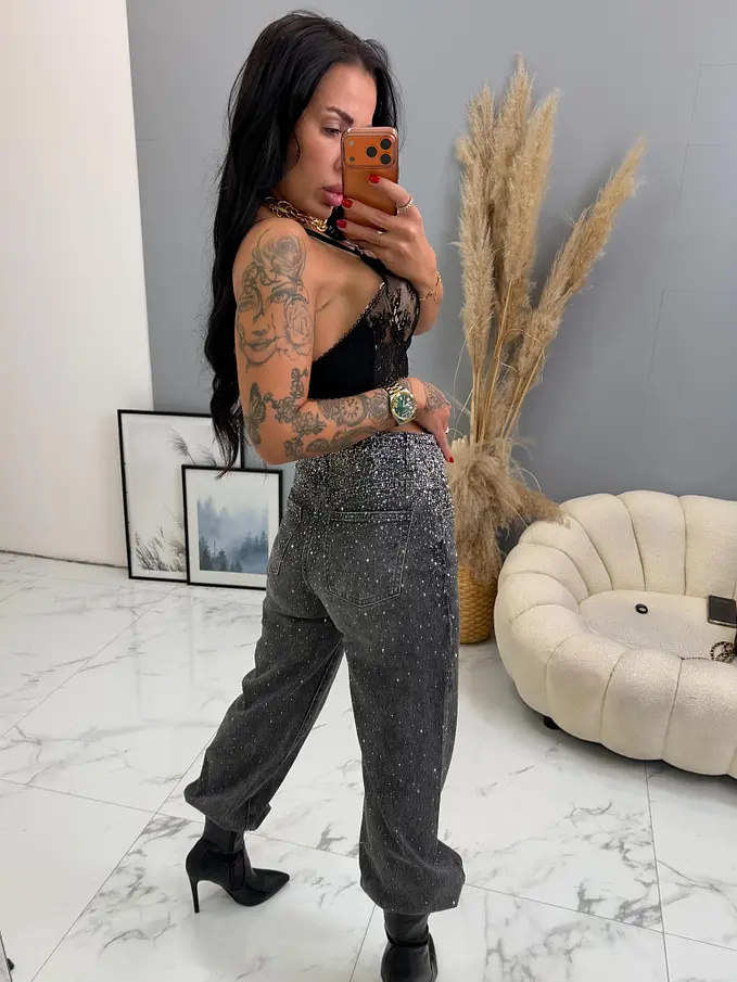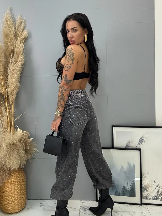 Prémium minőség. Magas derék. Anyaga kellemes, elasztikus. A gombok ezüst színűek. Strasszkövekkel díszített.