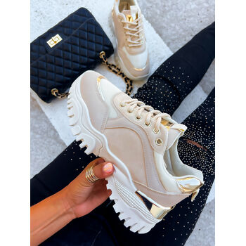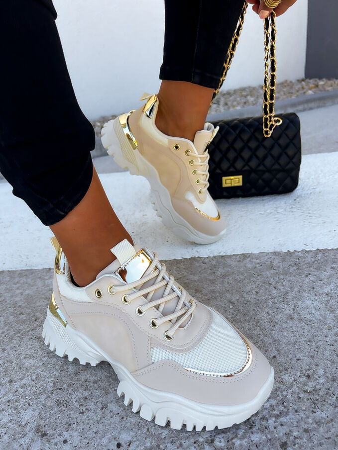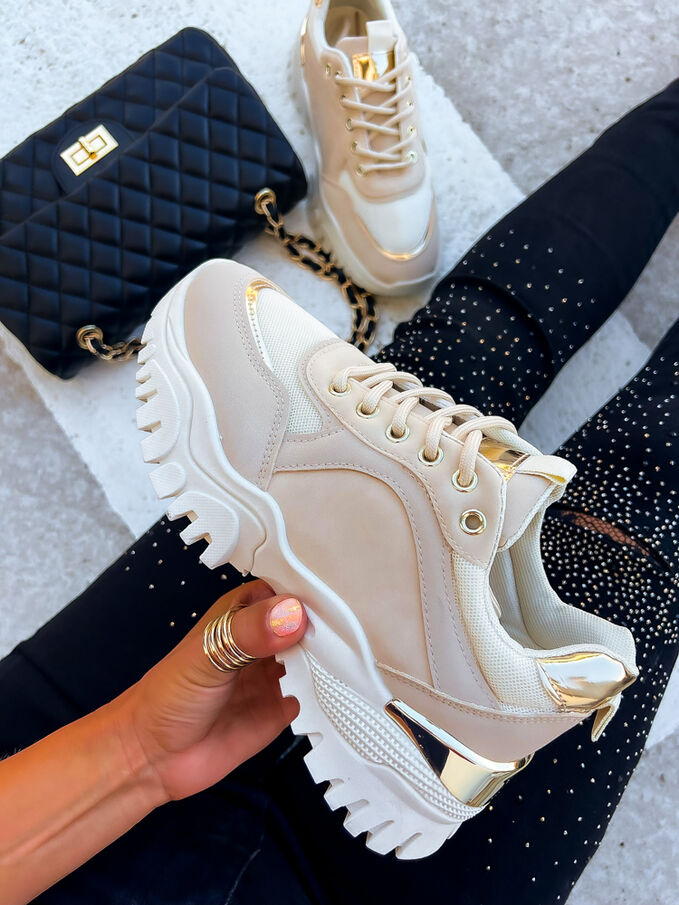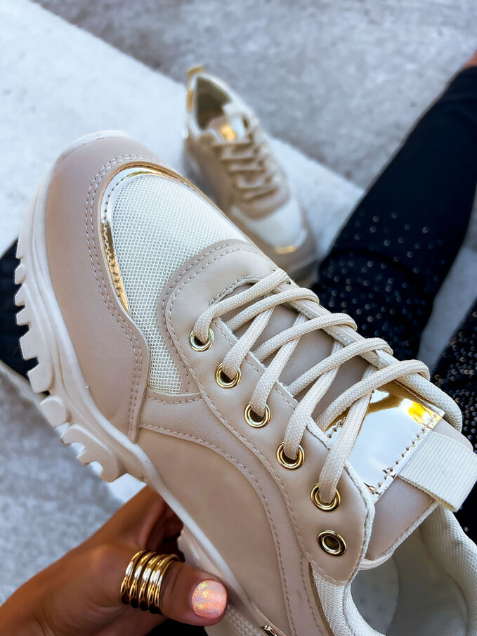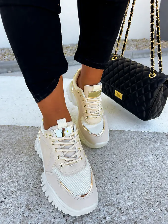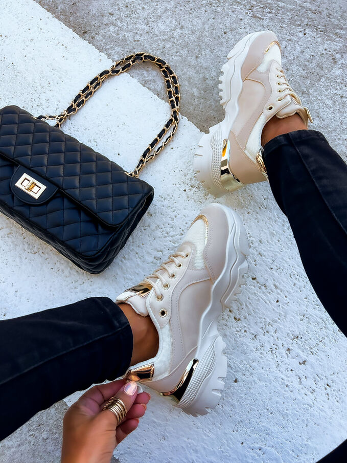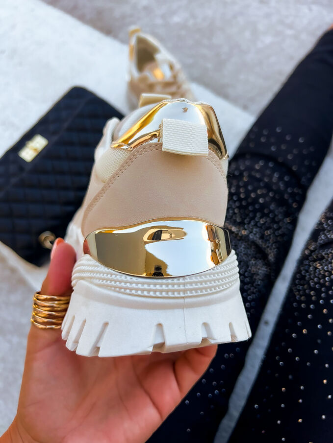 Élvezze a sportos eleganciát ebben a modern cipőben. A díszek arany színűek.