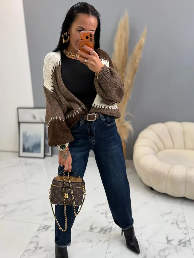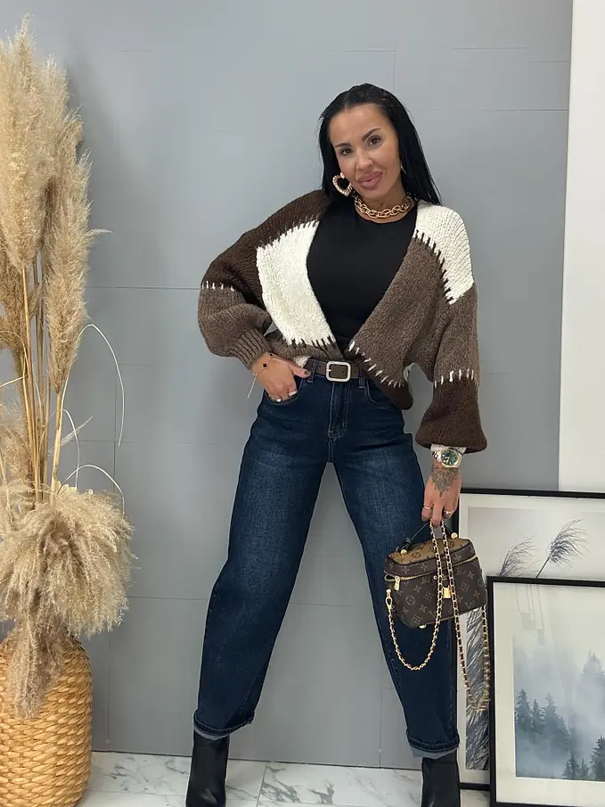 A fekete hajú modell 164 cm magas és 57 kg. XS méretű nadrágot visel.