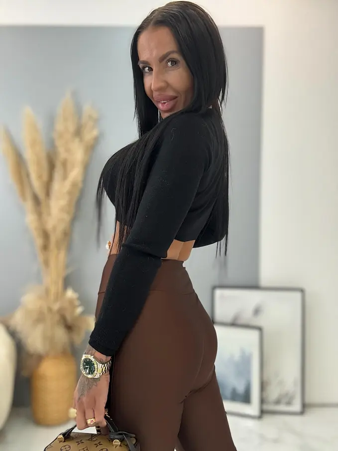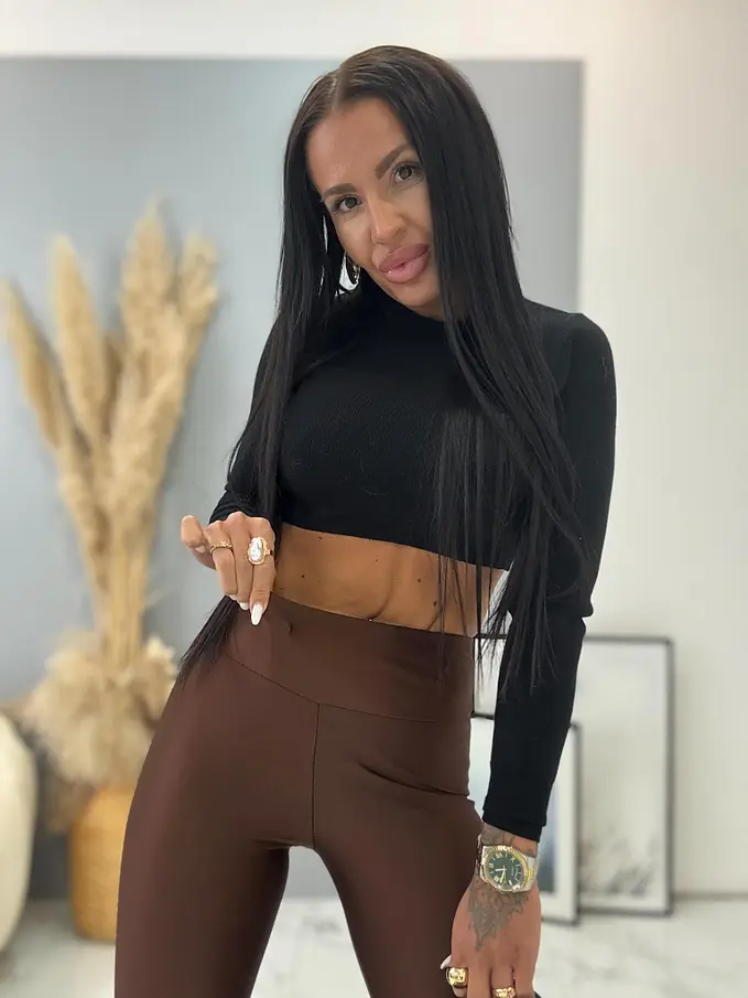 A fekete hajú modell 164 cm magas és 64 kg. M/L méretű ruhákat visel. Méretek: 99 cm - 74 cm - 93 cm.