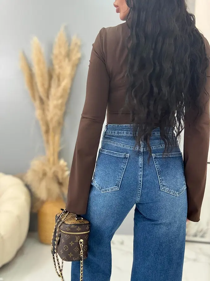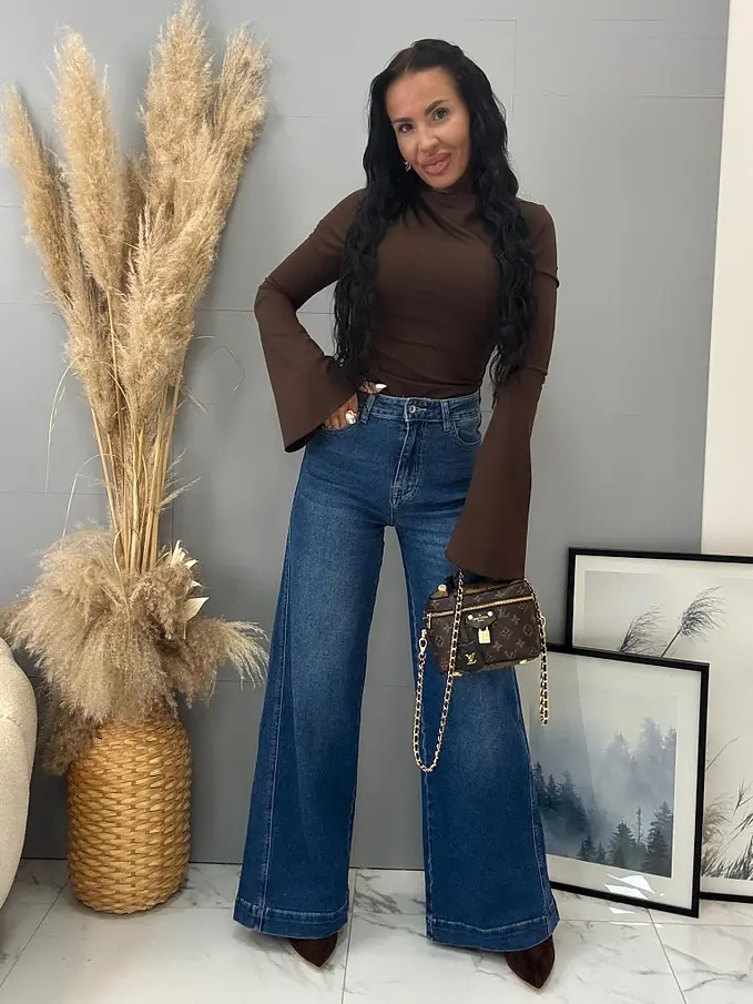 A fekete hajú modell 164 cm magas és 57 kg. XS méretű nadrágot visel.