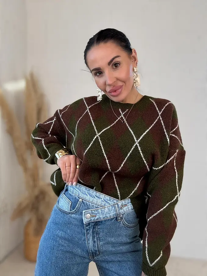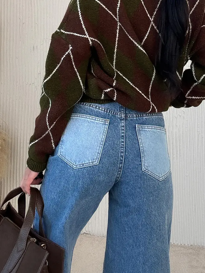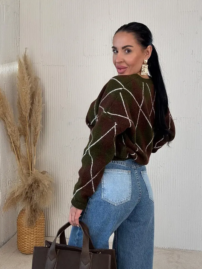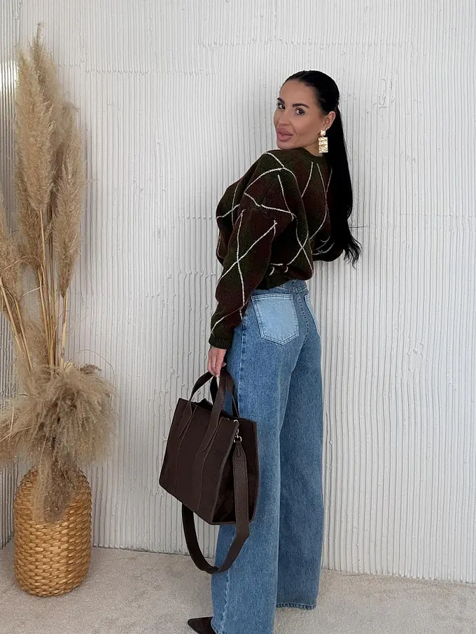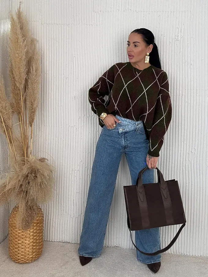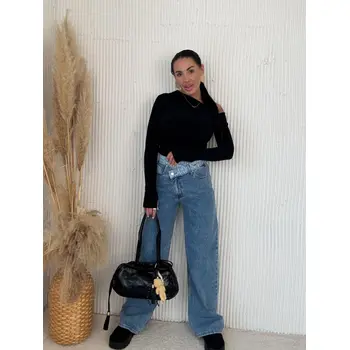 A fekete hajú modell 164 cm magas és 57 kg. XS méretű nadrágot visel.