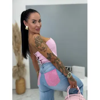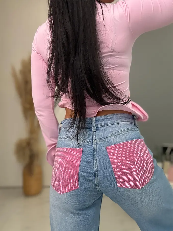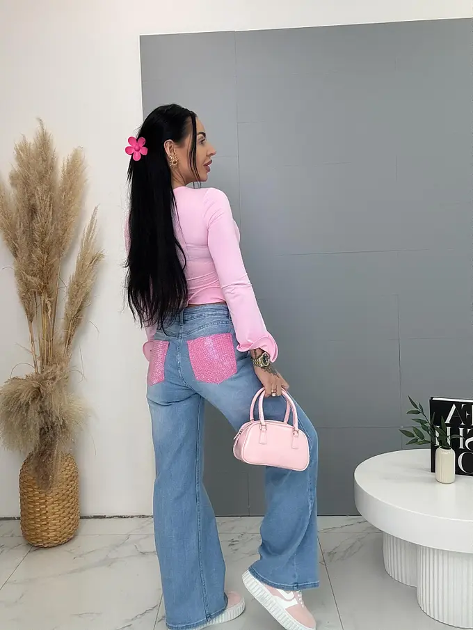 Magas derekú wide leg farmernadrág strassz díszítéssel a zsebeknél ELLE