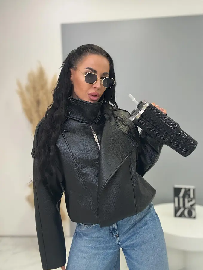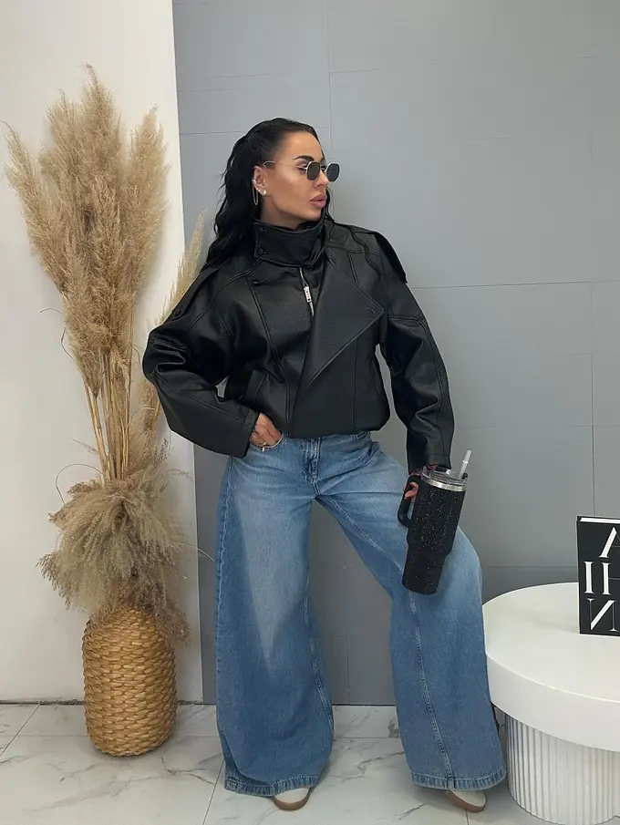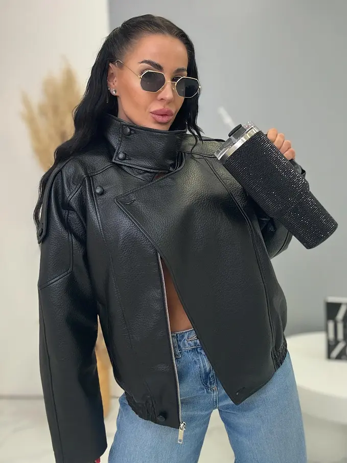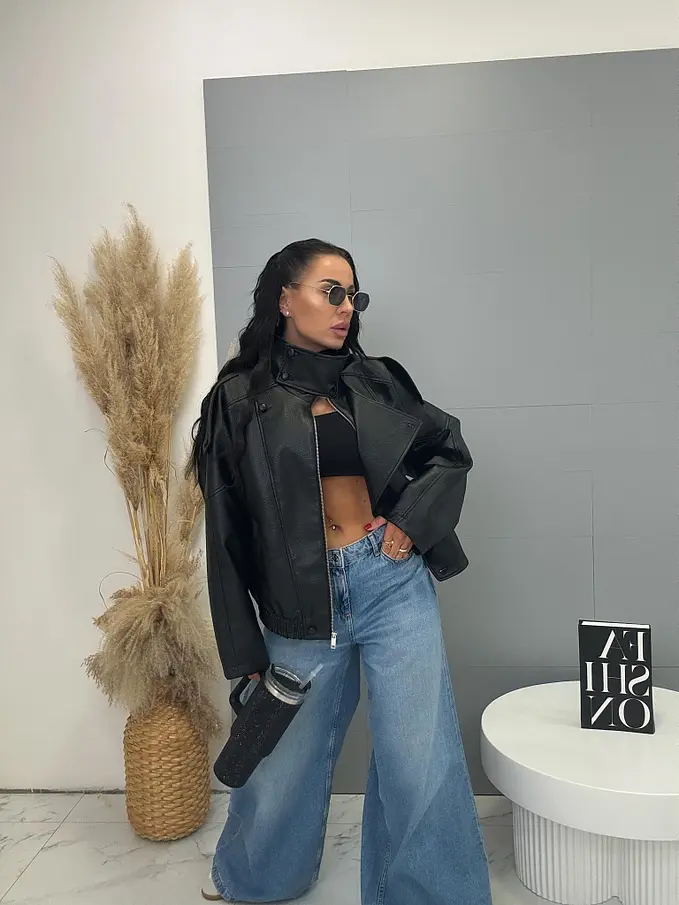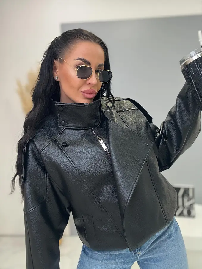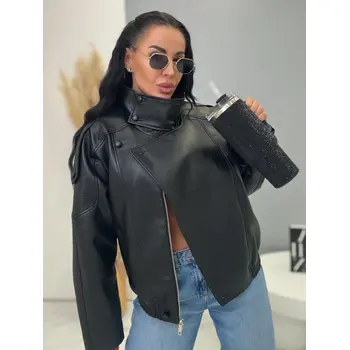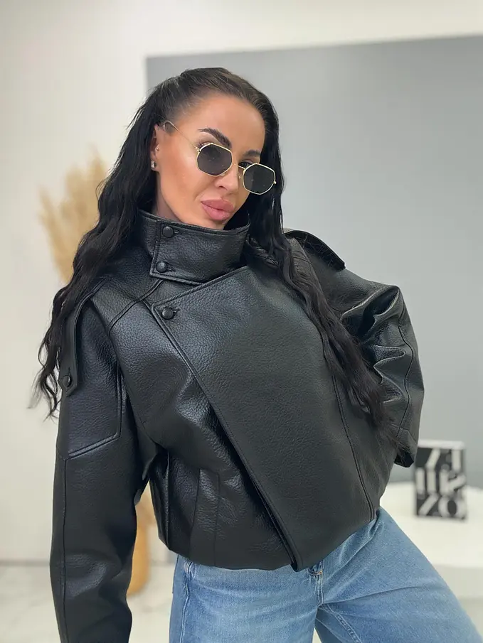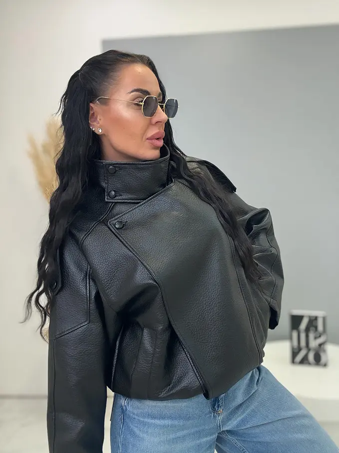 Bőrdzseki gallérral és bomber fazonnal. Praktikus oldalzsebekkel és elasztikus szegéllyel rendelkezik. Gombokkal és arany cipzárral záródik. Az anyag nem rugalmas, béléssel készült.