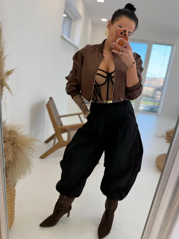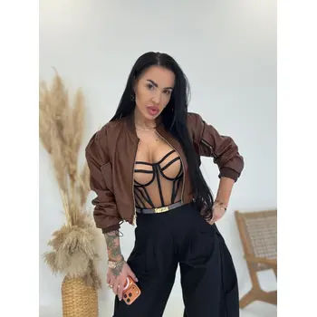Rövid műbőr dzseki. Arany színű cipzárral, alul húzózsinórral állítható.
