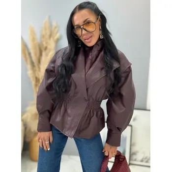 Rövid műbőr dzseki. A részletek fekete színűek, gumis derékkal.