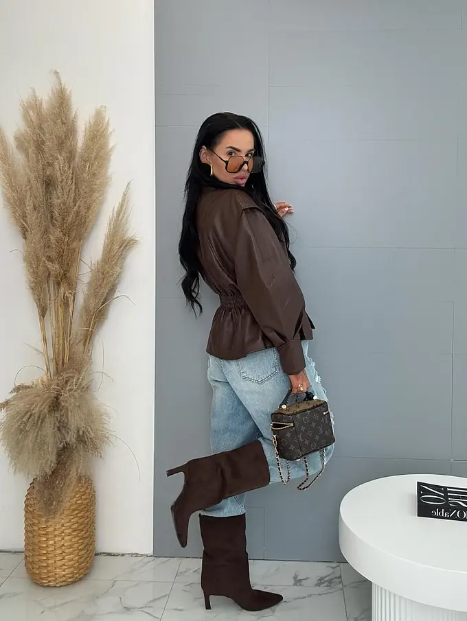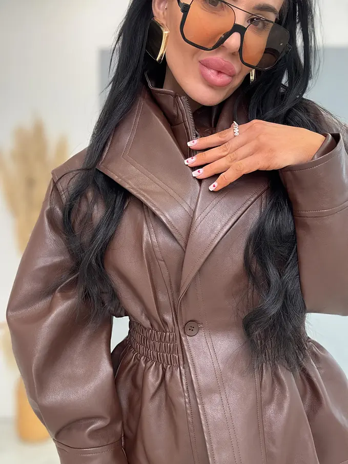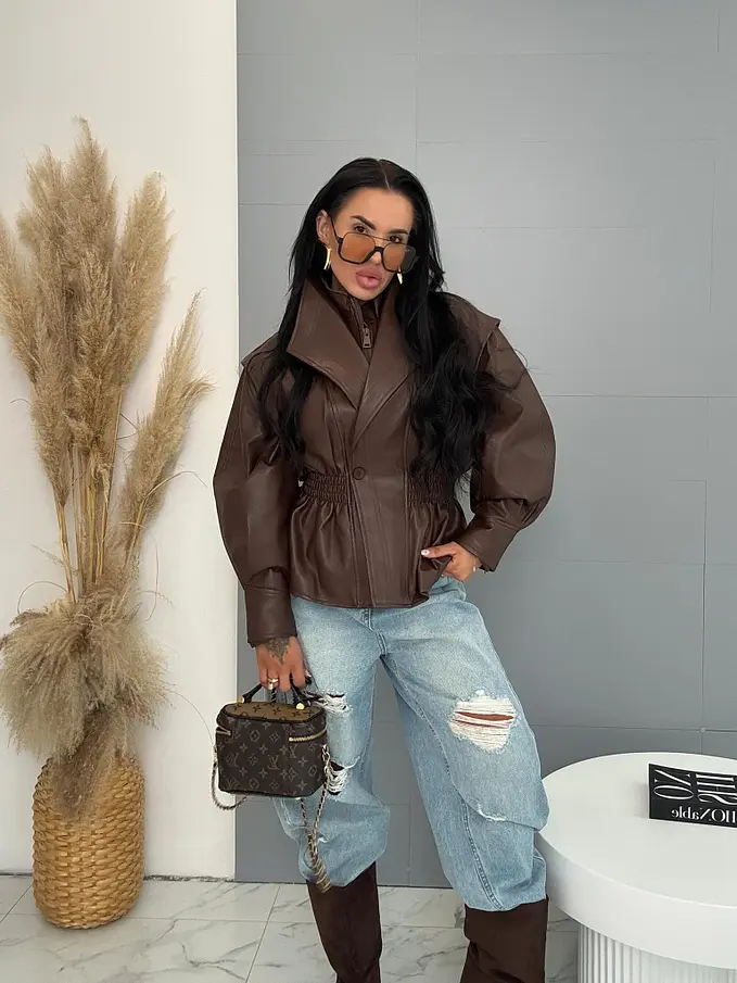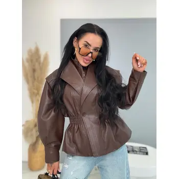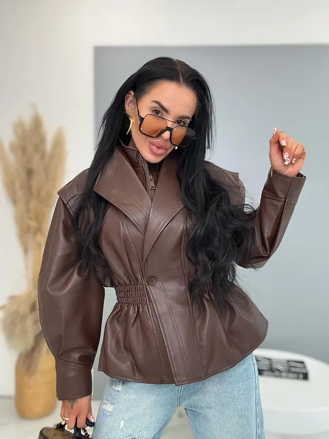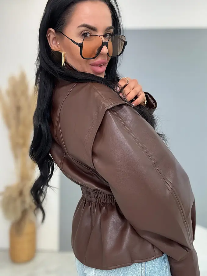 Rövid műbőr dzseki. A részletek fekete színűek, gumis derékkal.