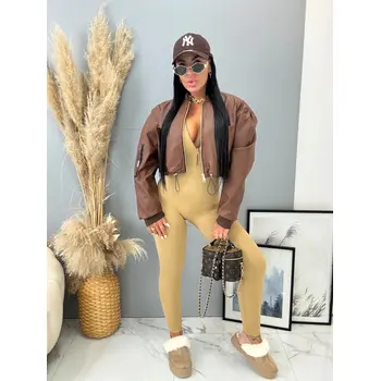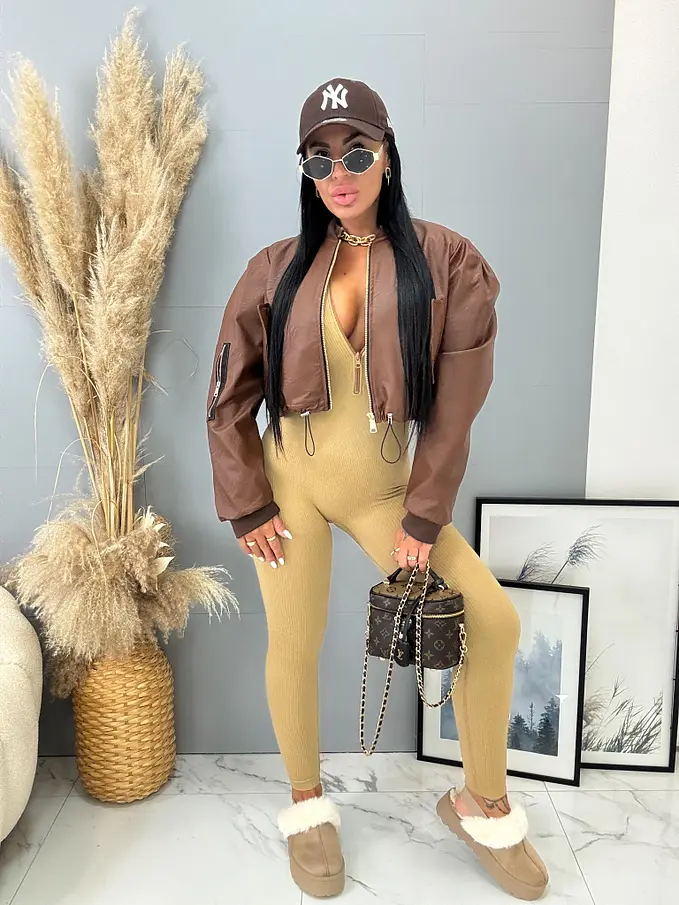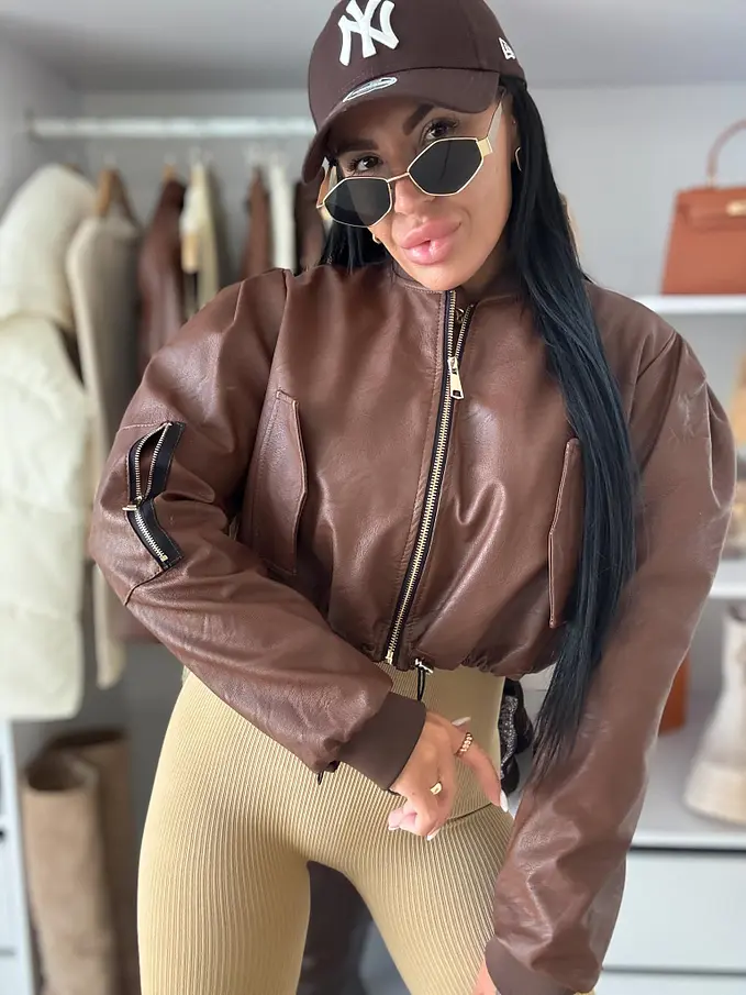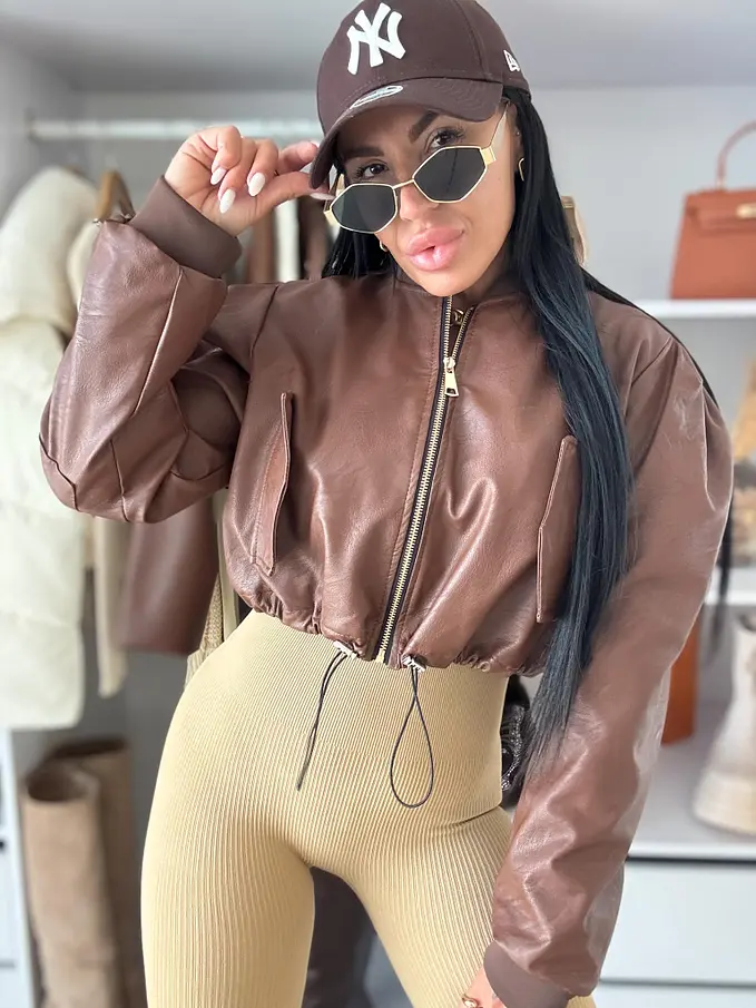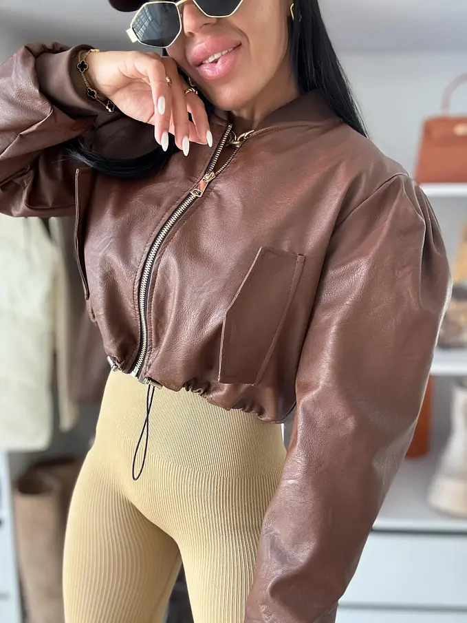 Rövid műbőr dzseki. Arany színű cipzárral, alul húzózsinórral állítható.