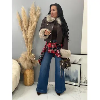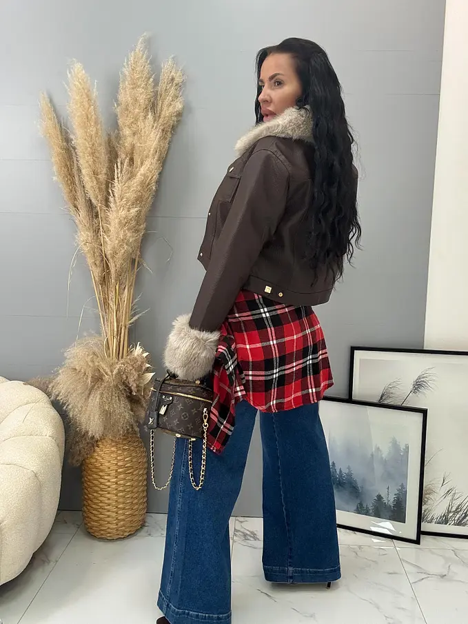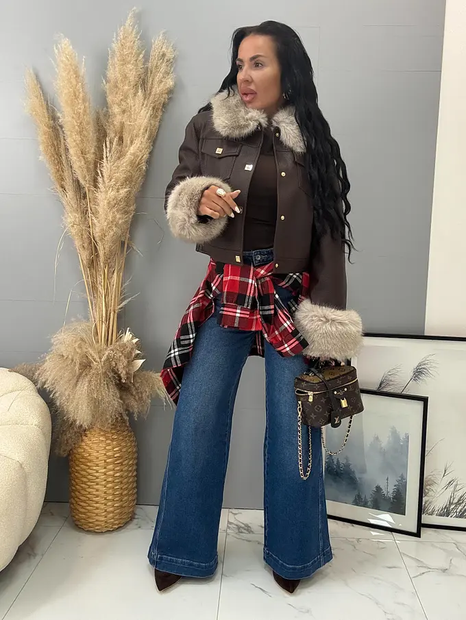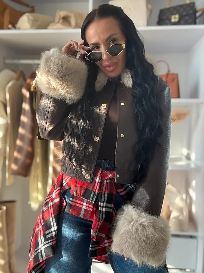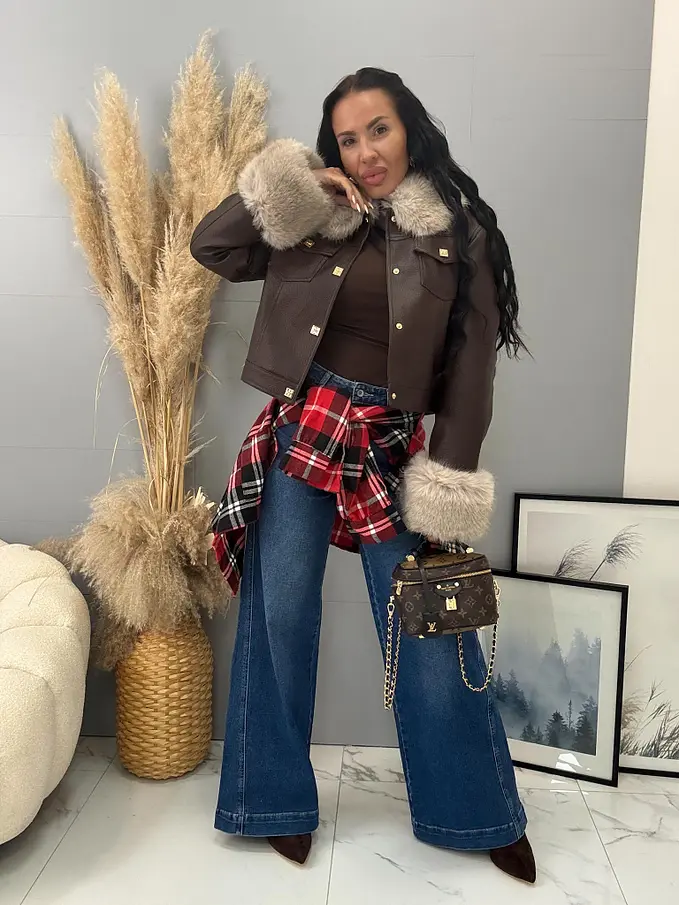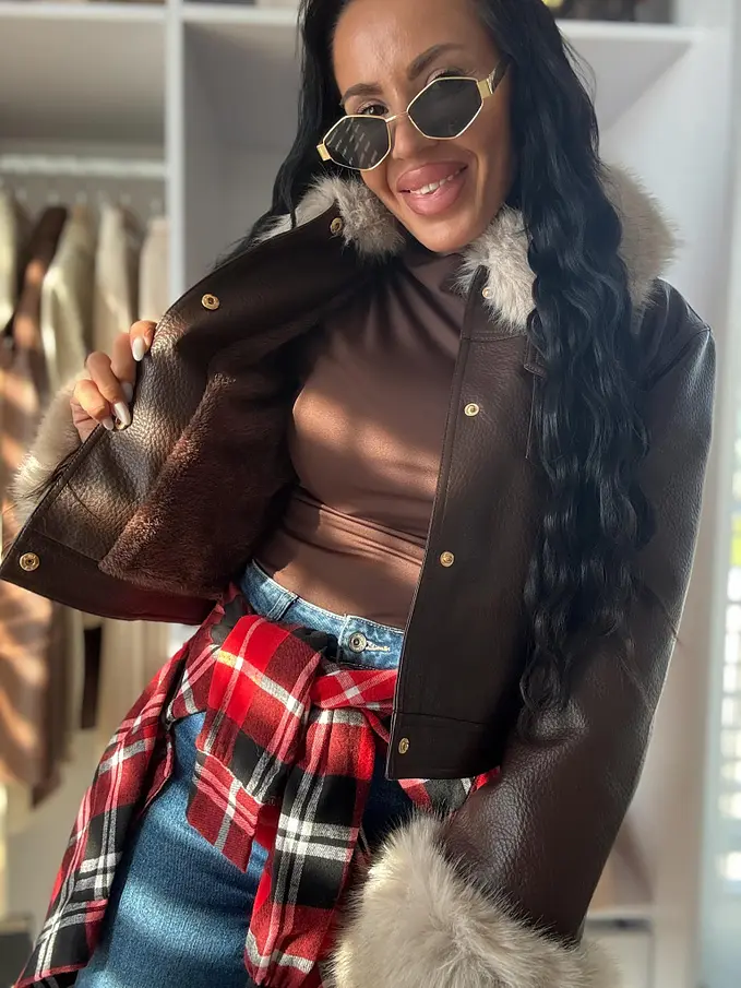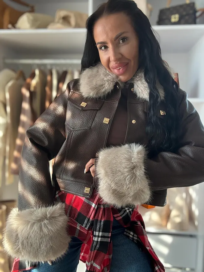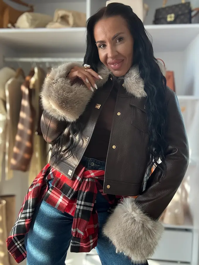 Bőrdzseki levehető szőrmés díszítéssel a galléron és a karokon. Szőrmés béléssel. A részletek arany színűek. Oldalsó zsebekkel.