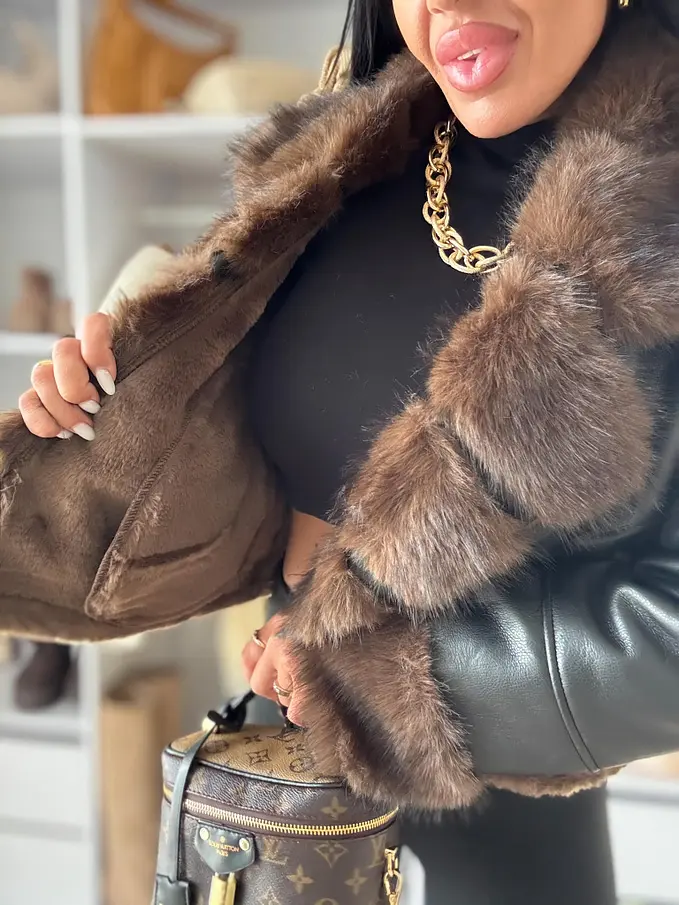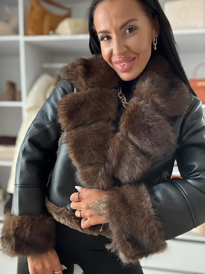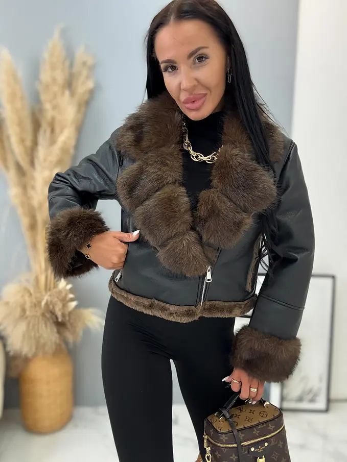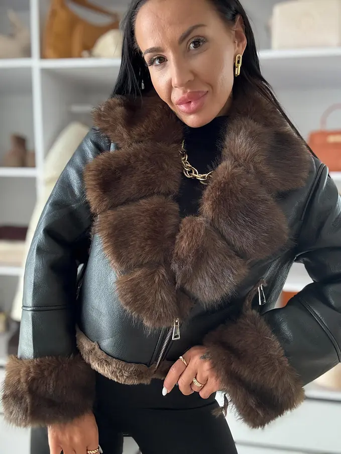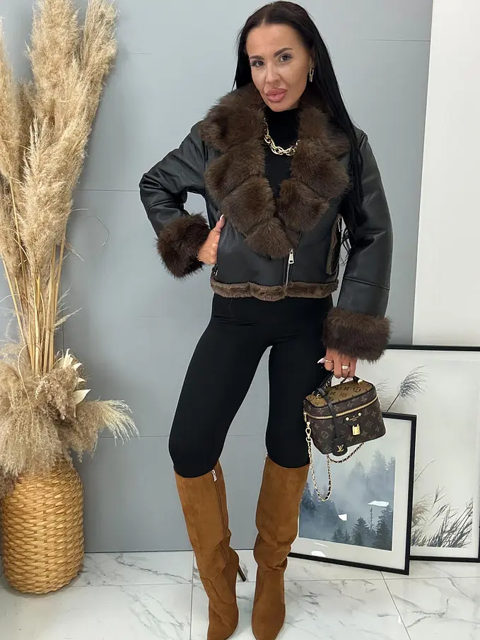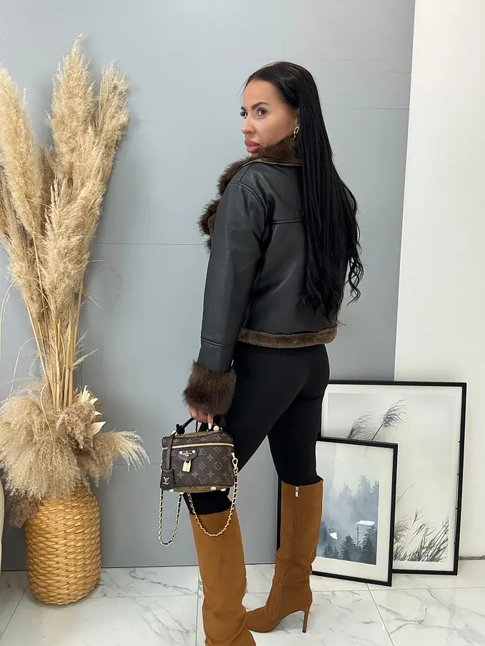 Bőrdzseki nem levehető szőrmés díszítéssel a galléron és az ujján. Szőrmés béléssel. A részletek ezüst színűek. Oldalsó zsebekkel.