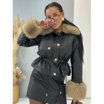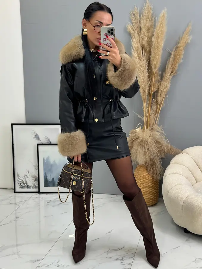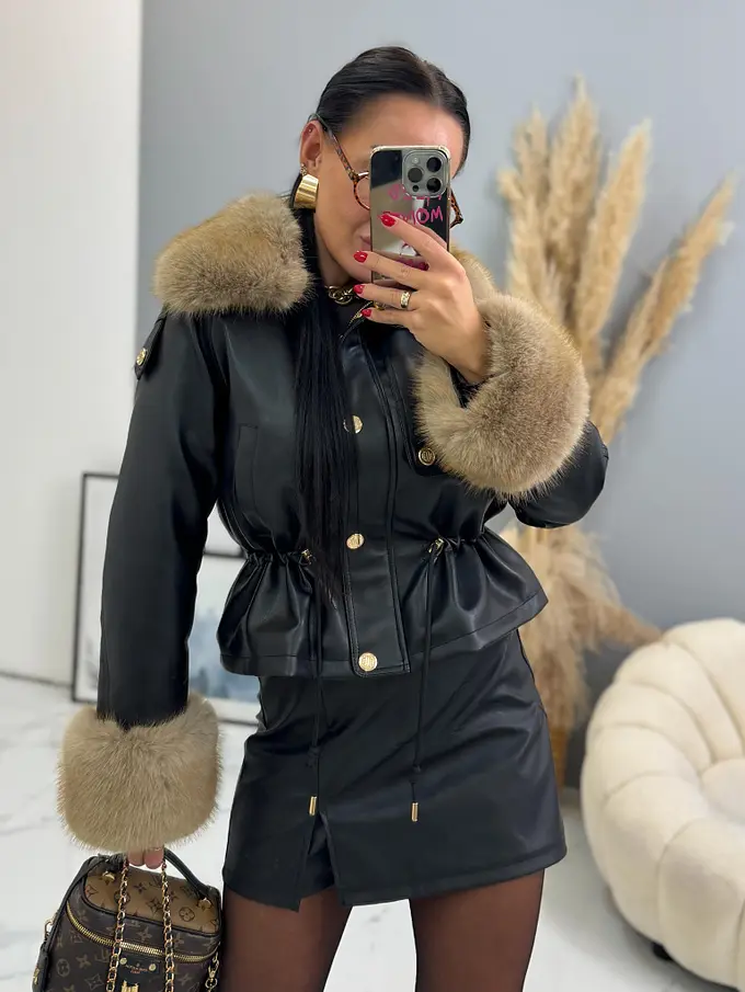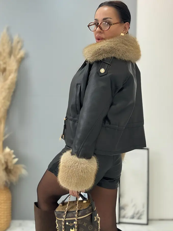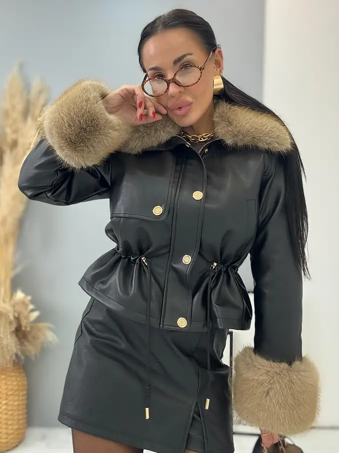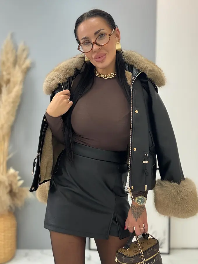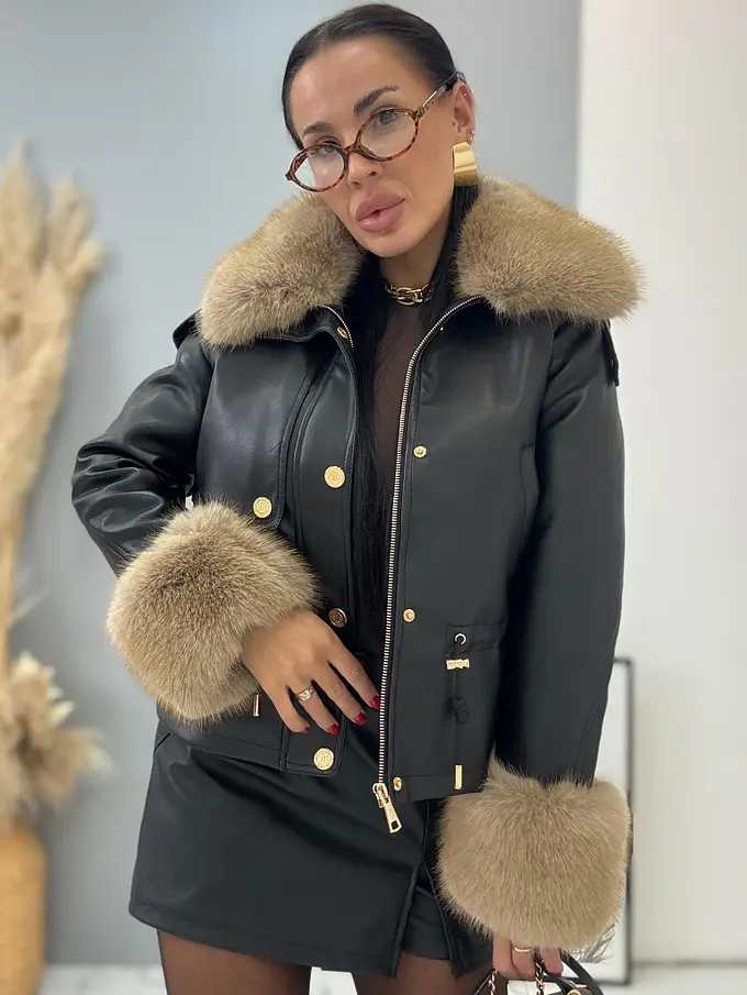 Bőrdzseki levehető szőrmés díszítéssel a galléron és a karokon. Szőrmés béléssel. A részletek arany színűek. Oldalsó zsebekkel.