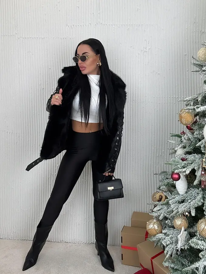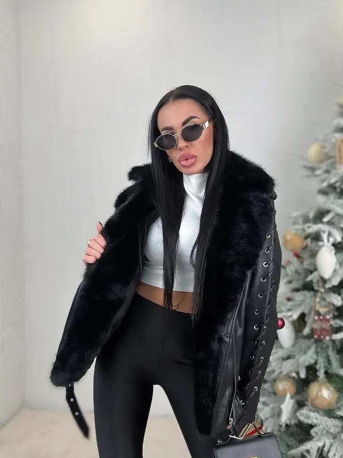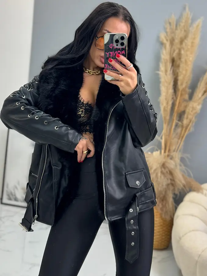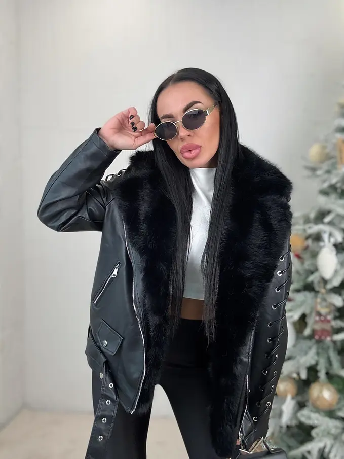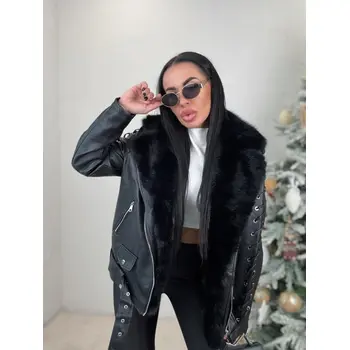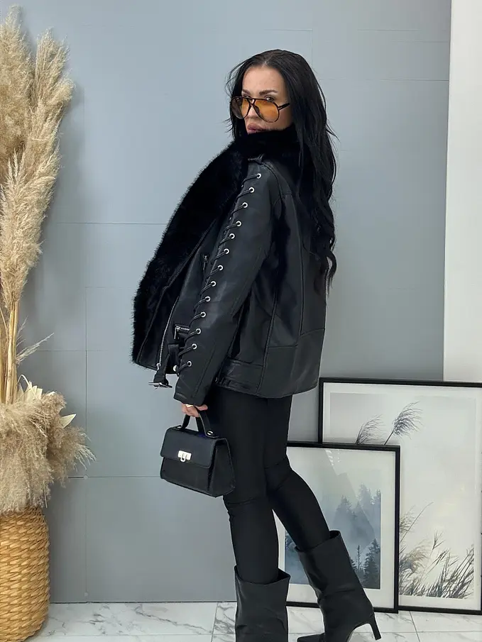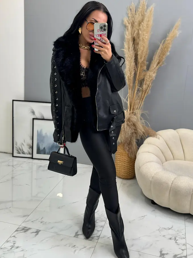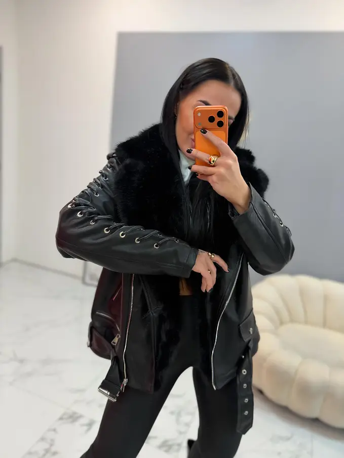Bőrdzseki levehető szőrmés díszítéssel a galléron. Szőrmés béléssel. A részletek ezüst színűek. Oldalsó zsebekkel.