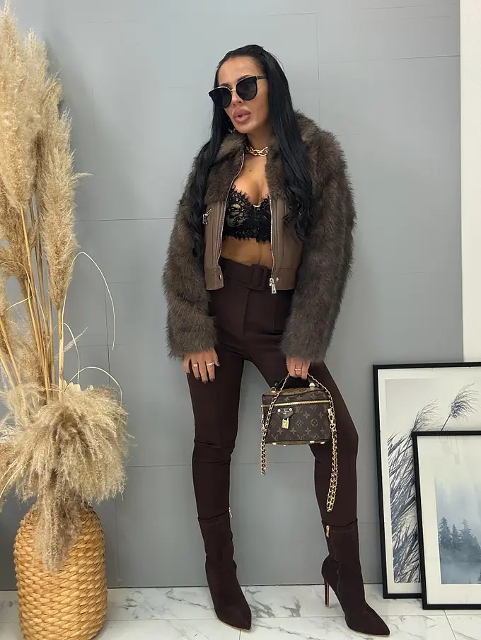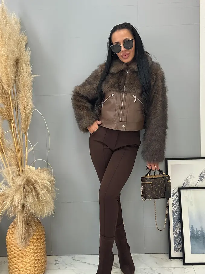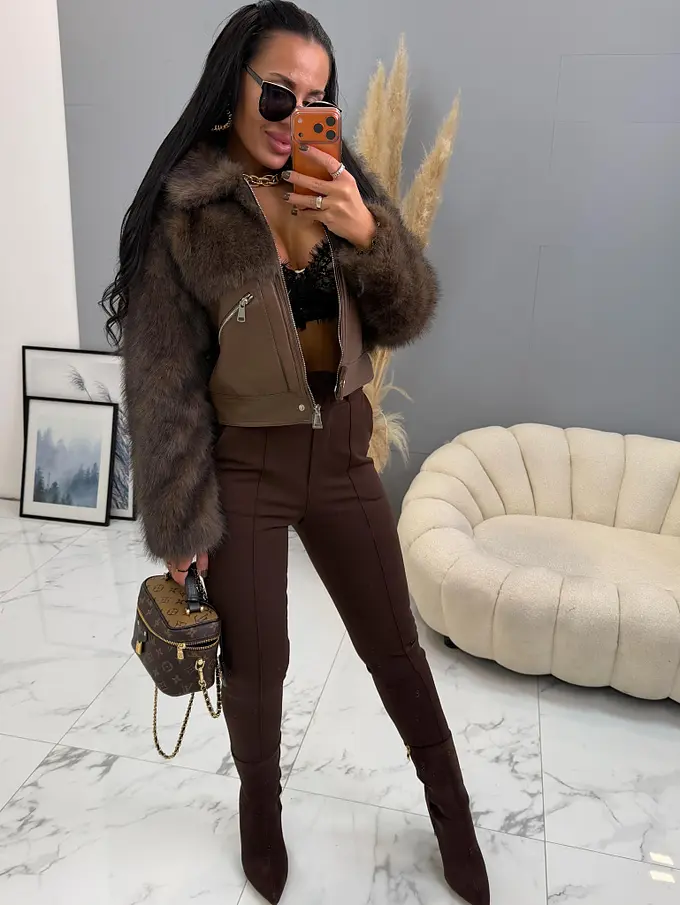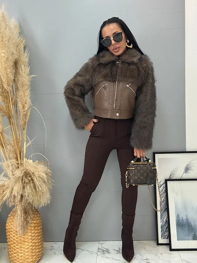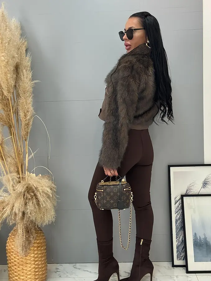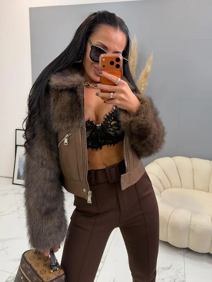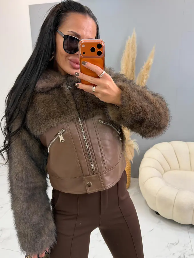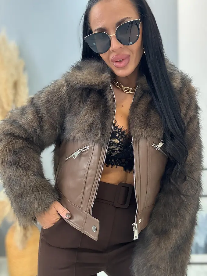 Bőrdzseki nem levehető szőrmével. Az elején két, cipzárral záródó zseb található. A cipzárak ezüst színűek.