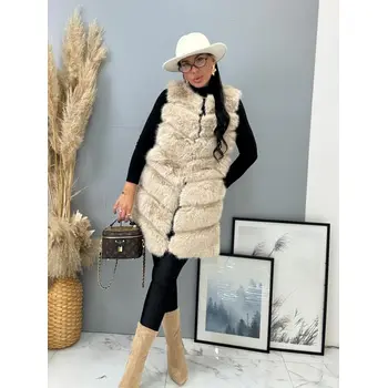Bőrmellény szőrmés díszítéssel. Oldalsó zsebekkel az elején. Kapcsokkal záródik.