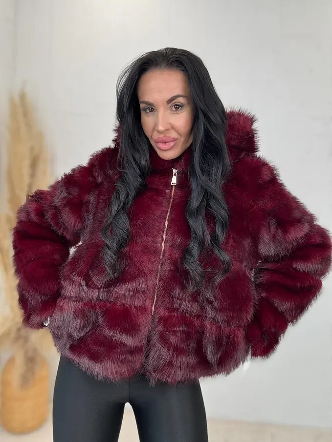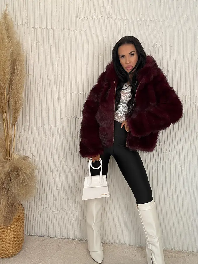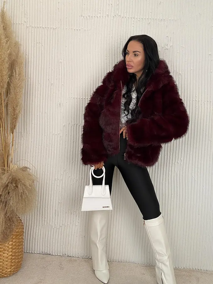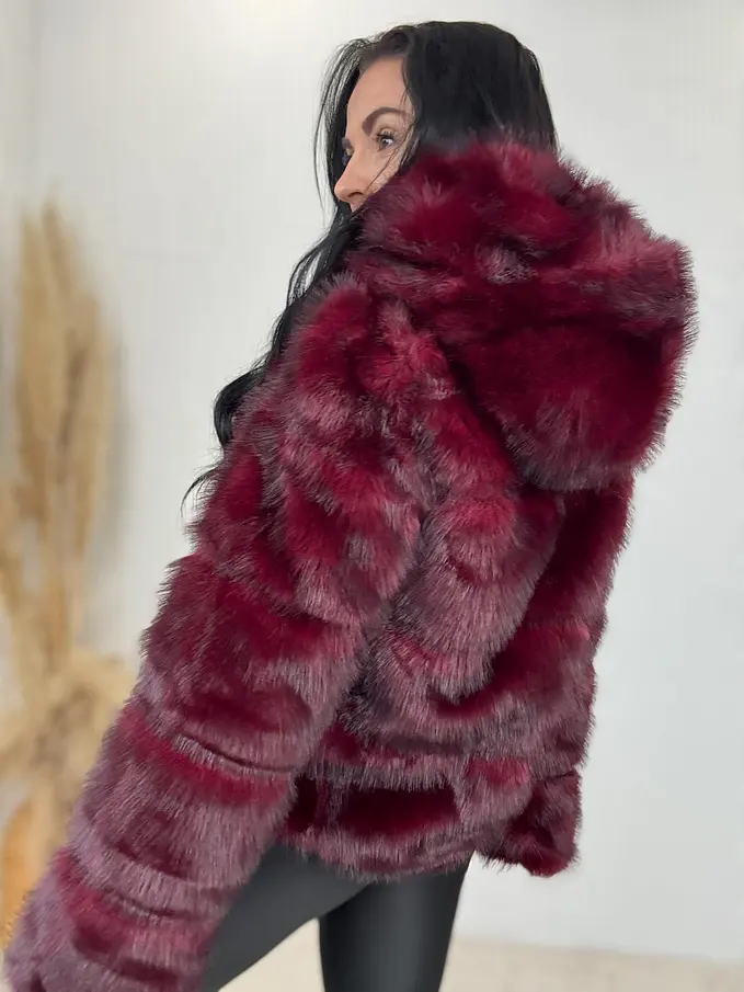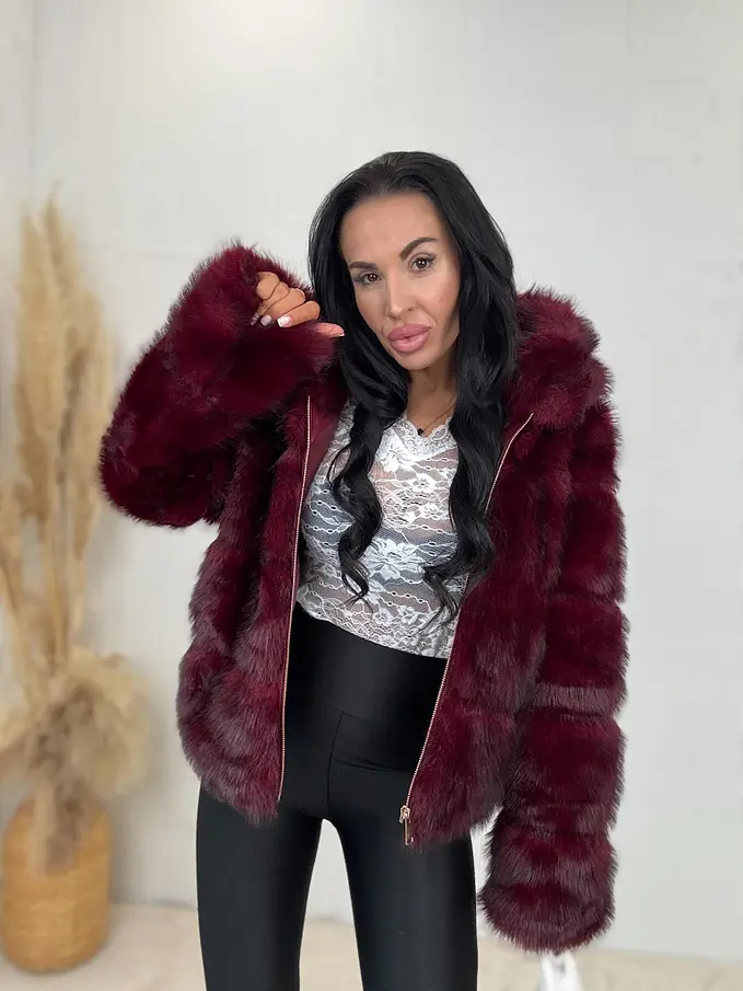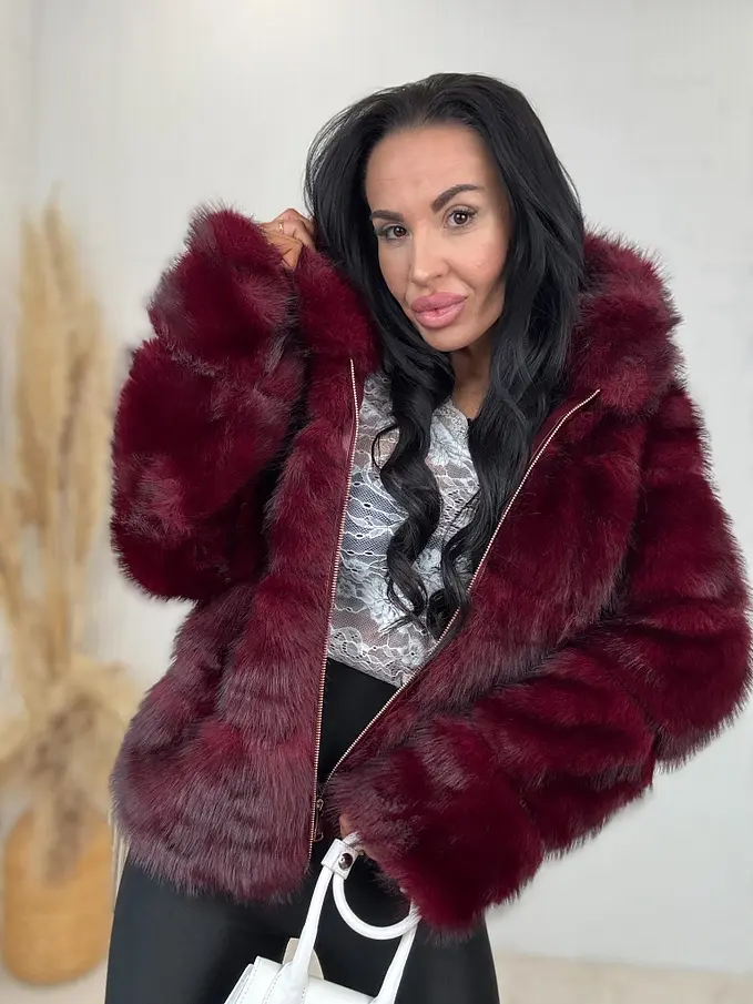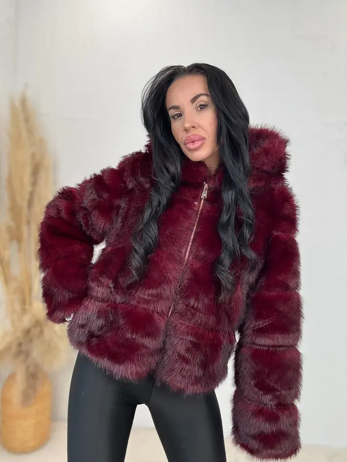 Műszőrmés műbőr kabát kapucnival CHERRY