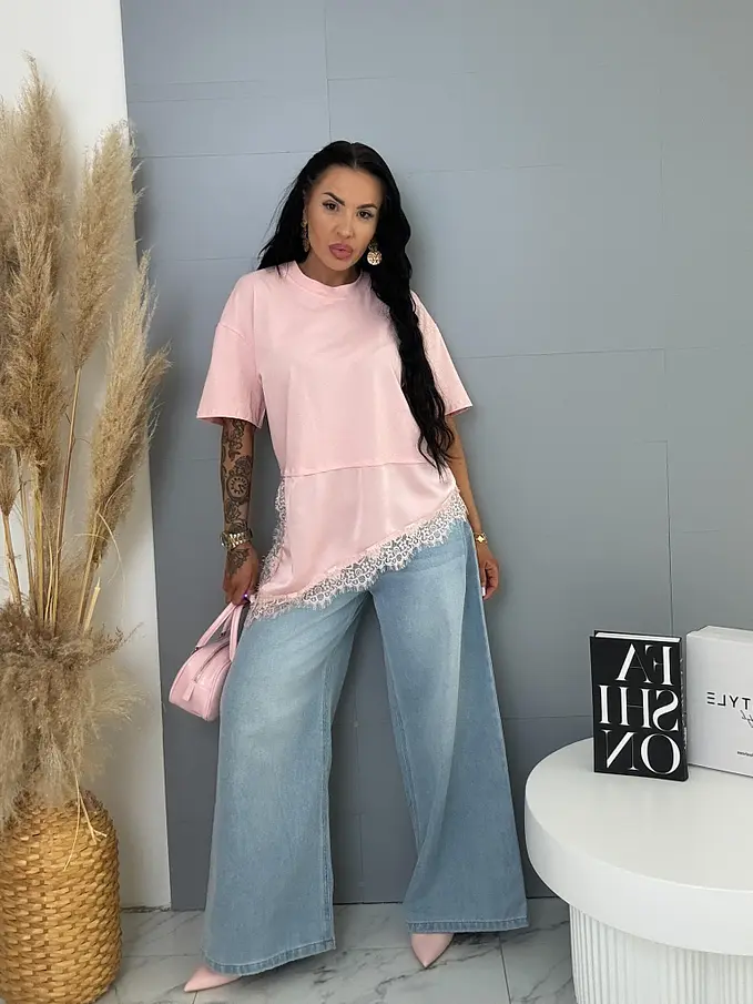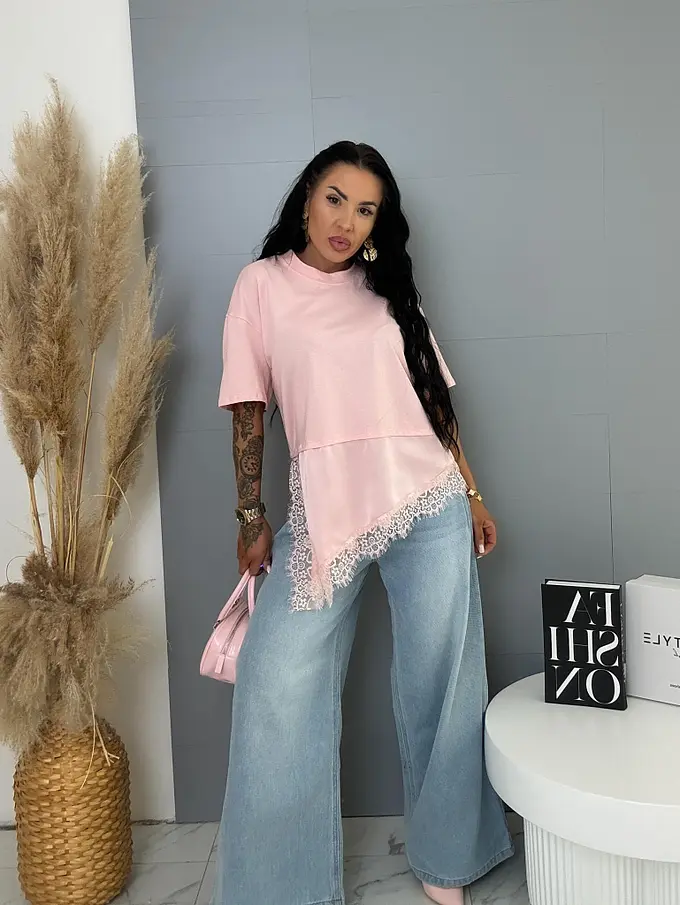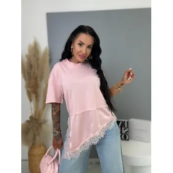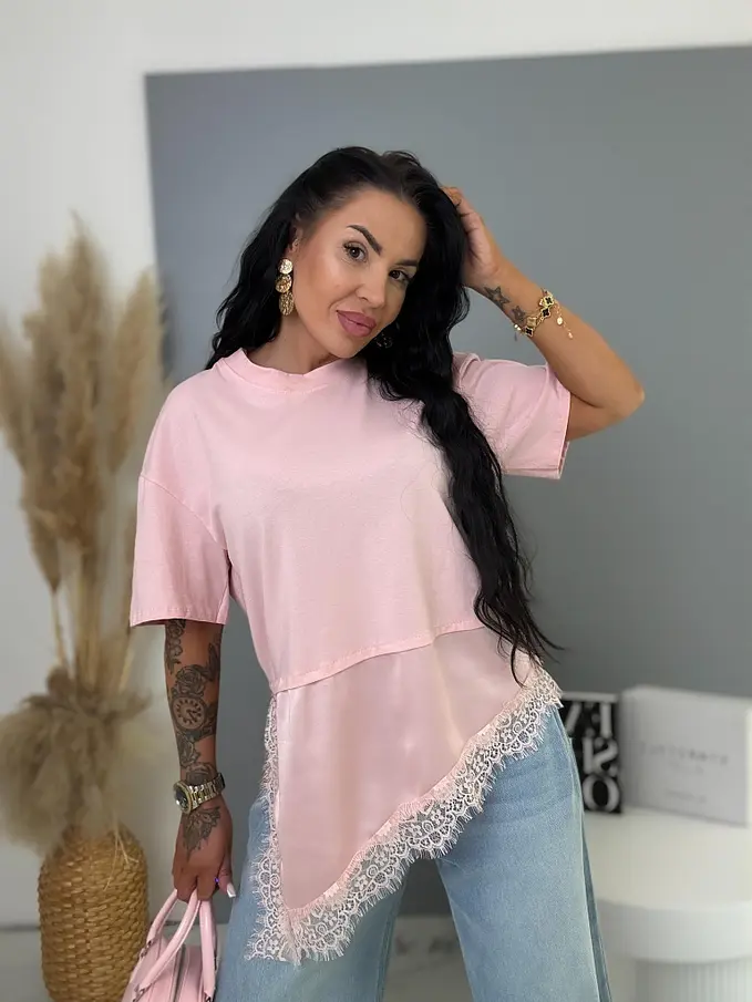 Prémium minőség. A póló kellemes, rugalmas anyagból készült, laza, aszimmetrikus szabással. Az alsó szegély csipkés díszítéssel.