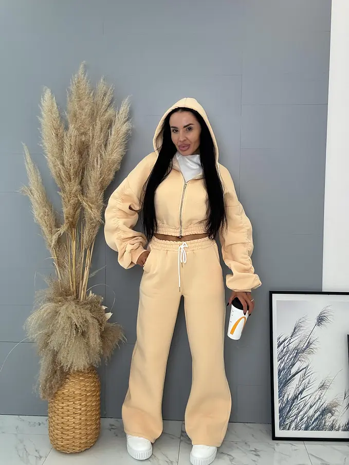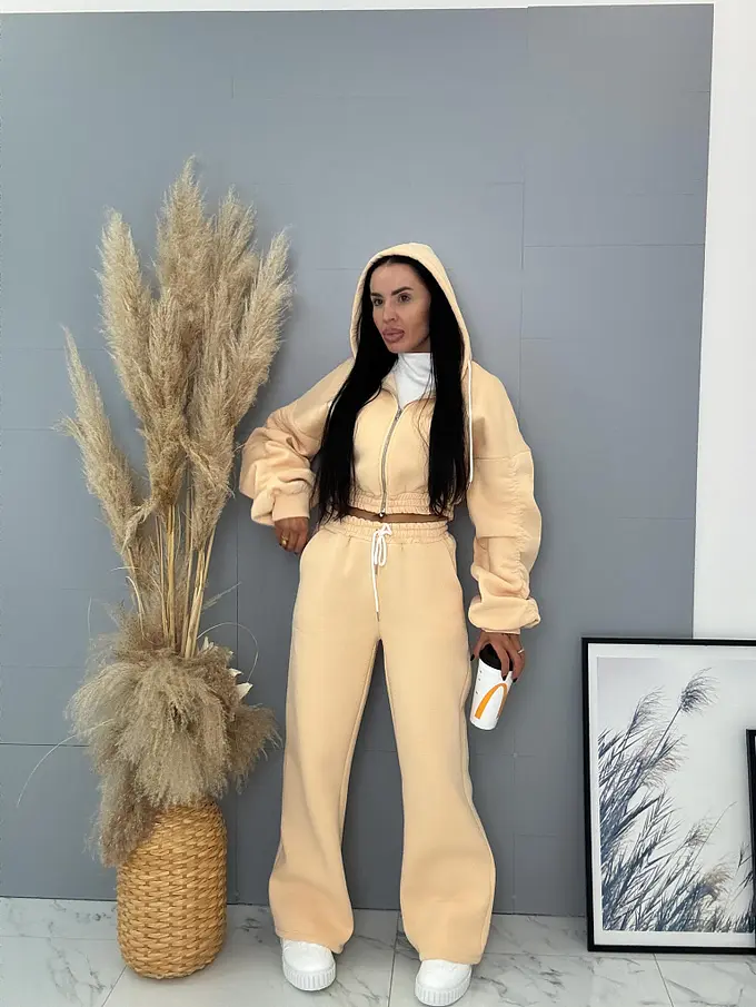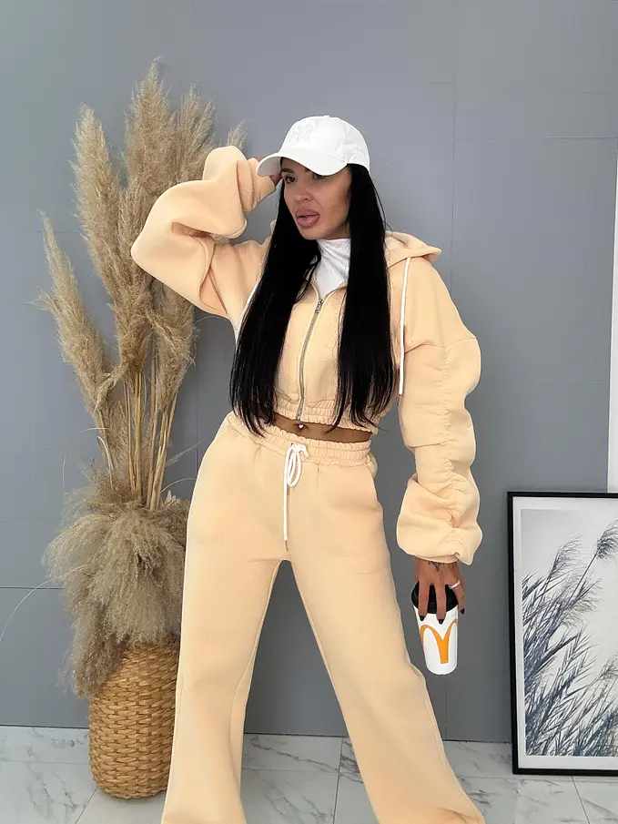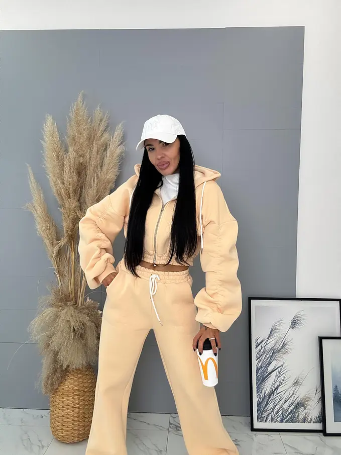 Női sportos együttes a legújabb kollekcióból. Felsőből és gumis derekú nadrágból áll. Anyaga kellemes, elasztikus, meleg.