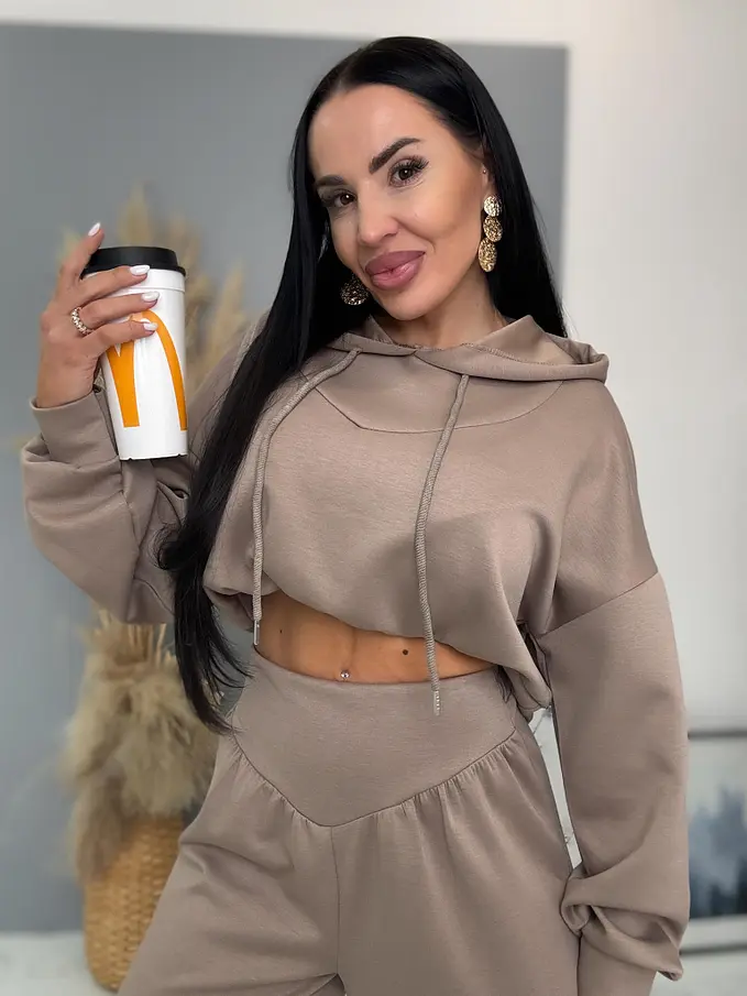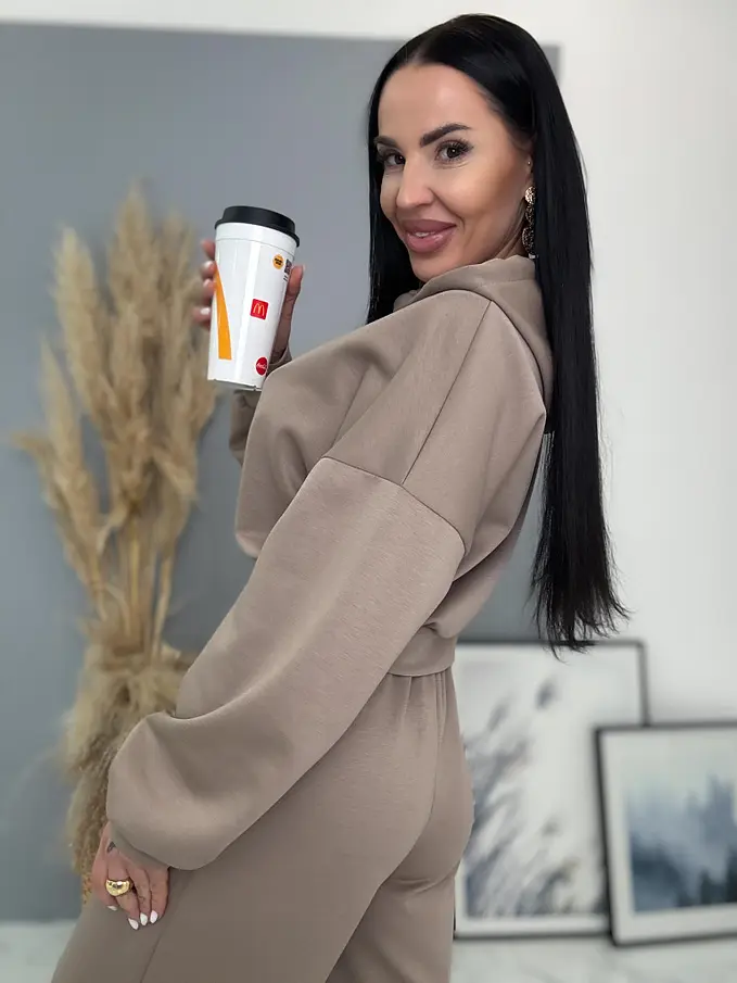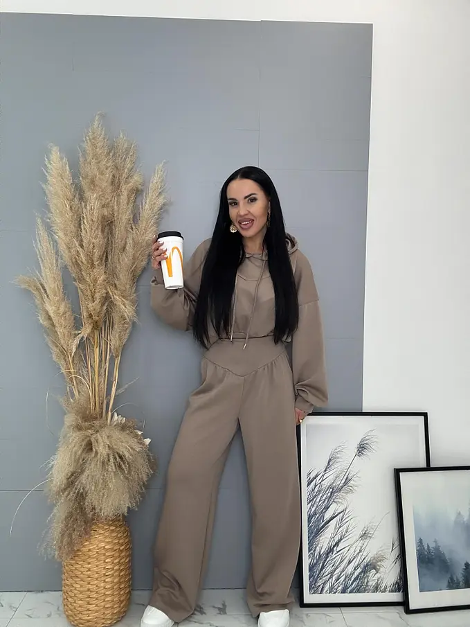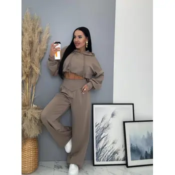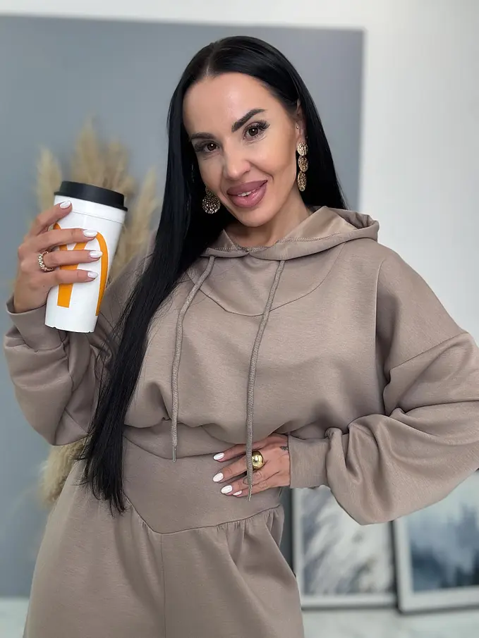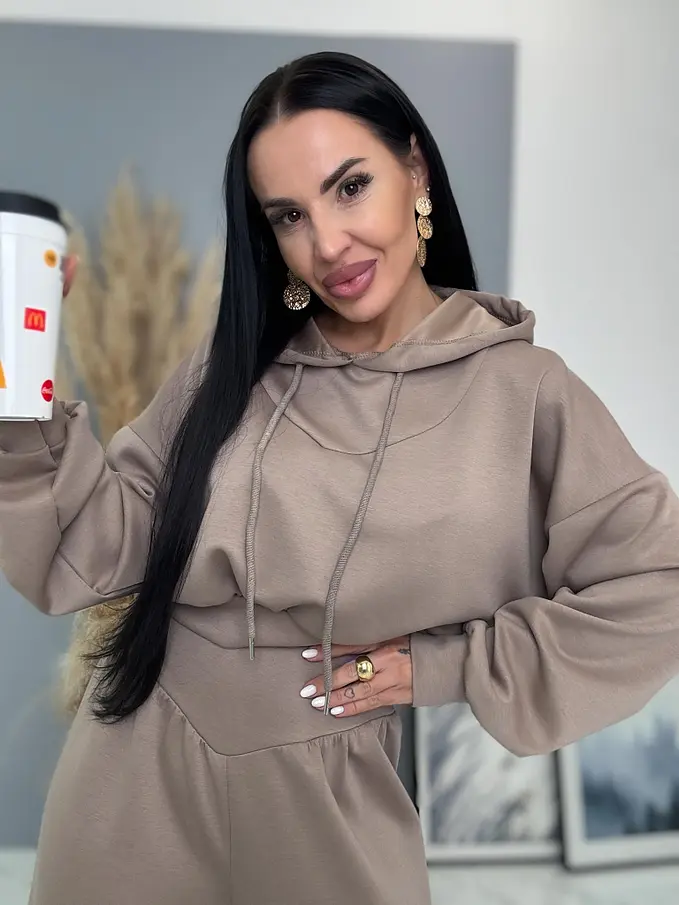 Női sportos együttes a legújabb kollekcióból. Felsőből és gumis derekú nadrágból áll. Anyaga kellemes, elasztikus, meleg.
