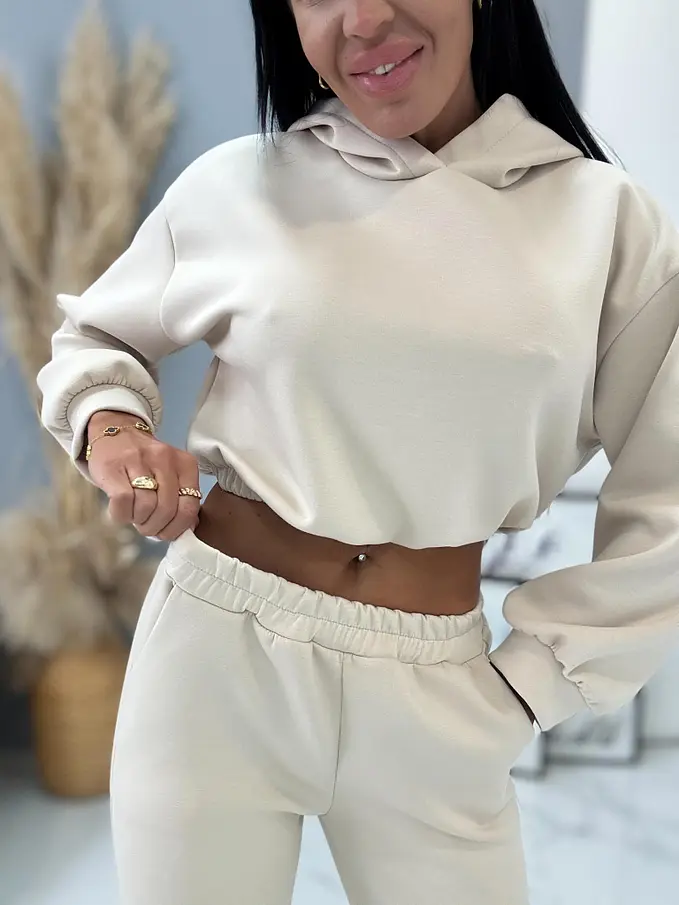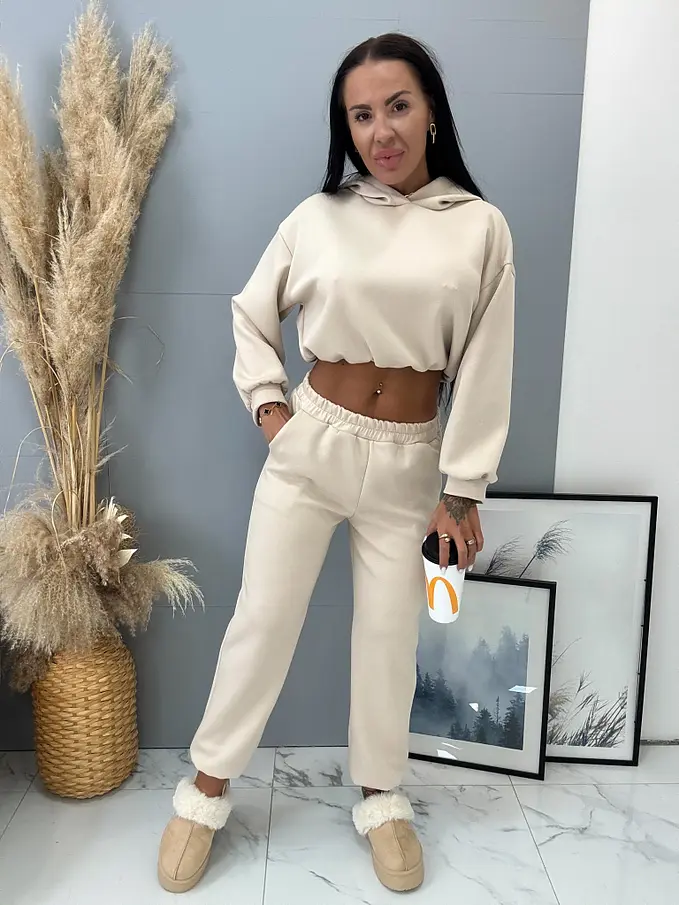 Női elegáns együttes a legújabb kollekcióból. Felsőből és gumis derekú nadrágból áll. Anyaga kellemes, elasztikus.