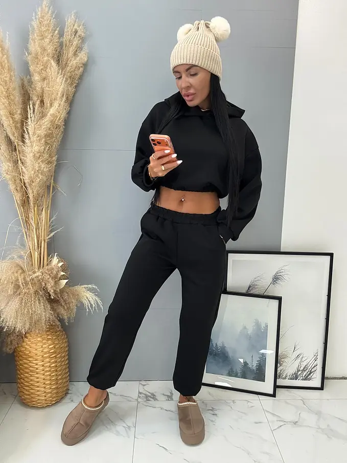 Női elegáns együttes a legújabb kollekcióból. Felsőből és gumis derekú nadrágból áll. Anyaga kellemes, elasztikus.