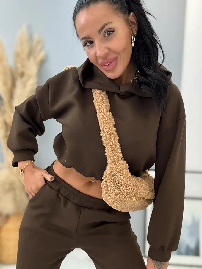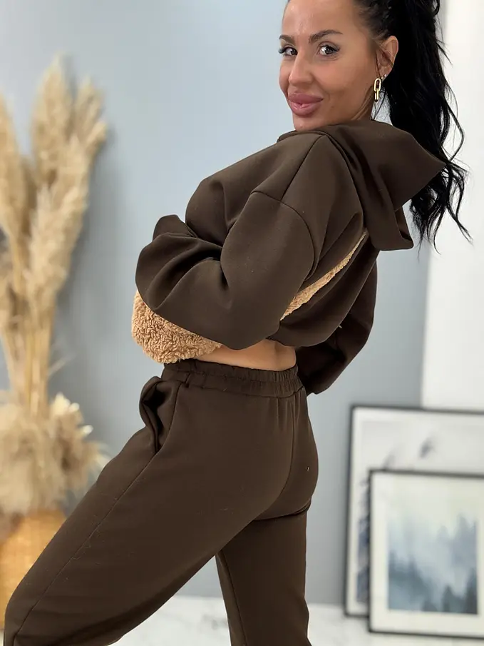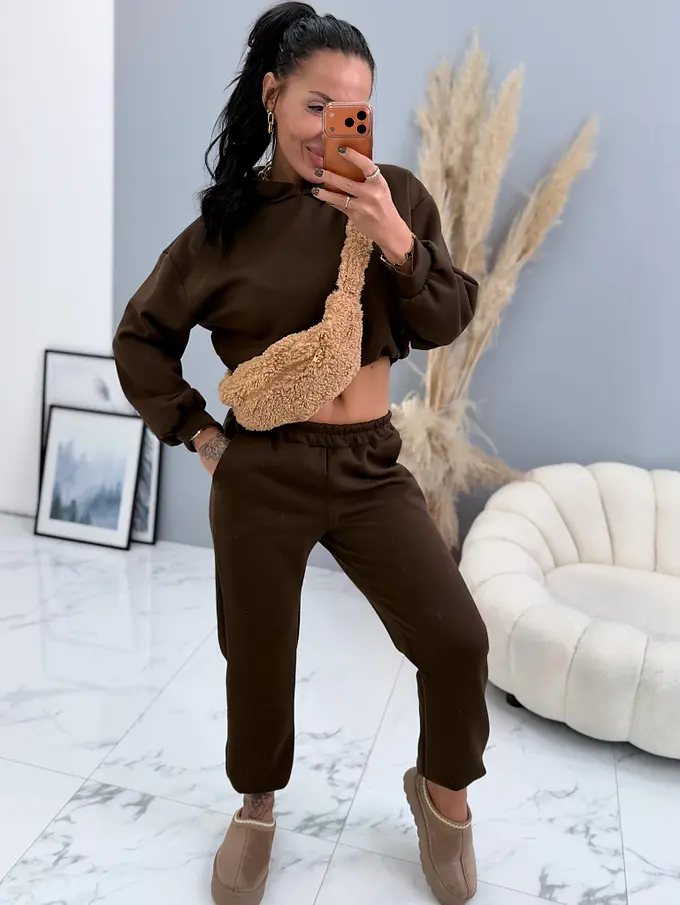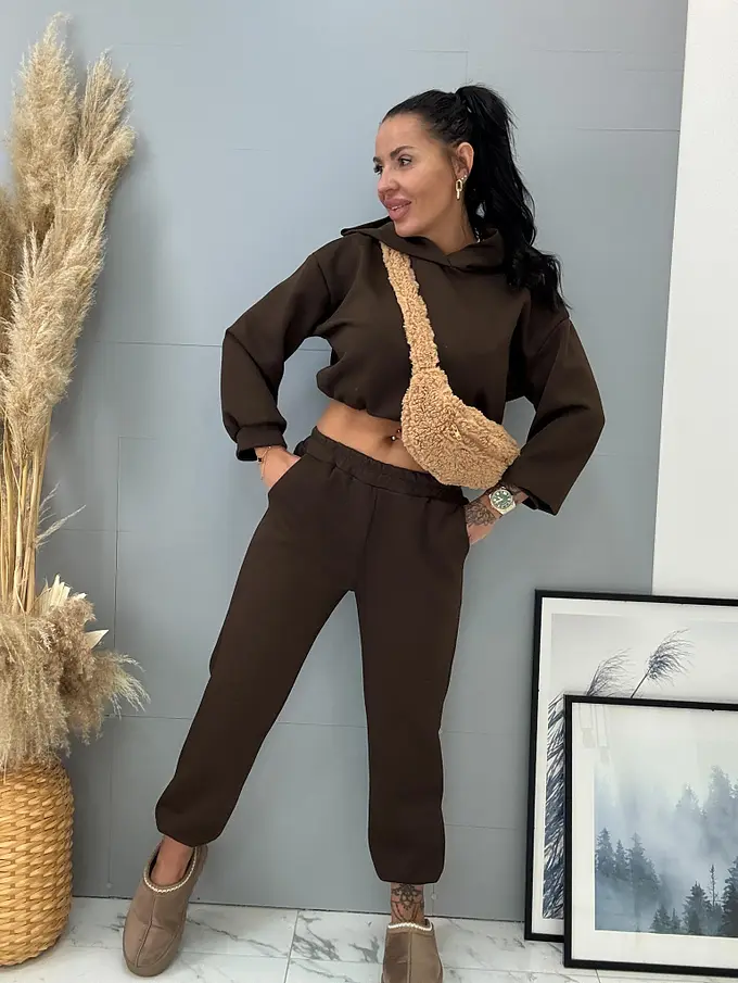 Női elegáns együttes a legújabb kollekcióból. Felsőből és gumis derekú nadrágból áll. Anyaga kellemes, elasztikus.