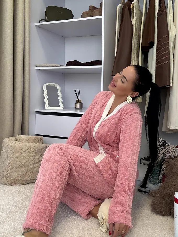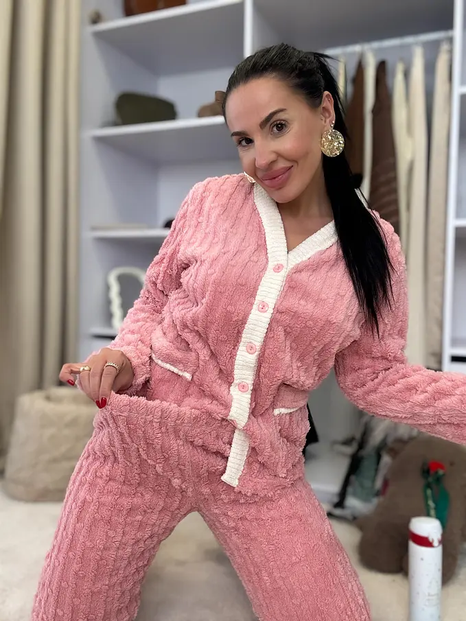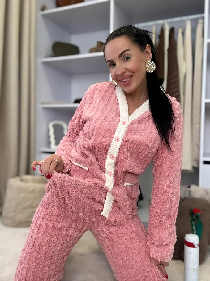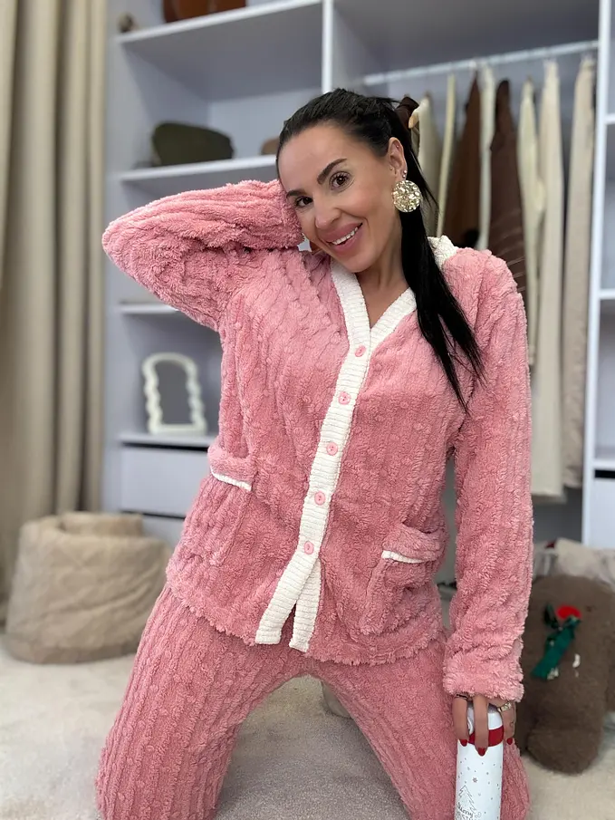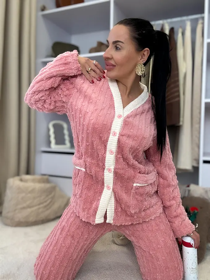 Puha meleg pizsama. A nadrág gumis derekú. A felső rész gombos záródással.