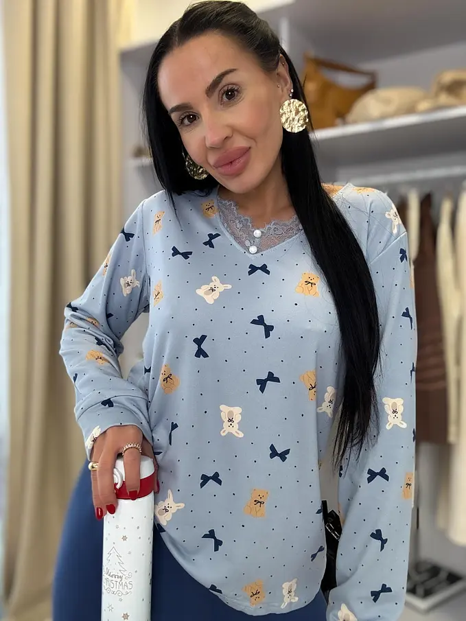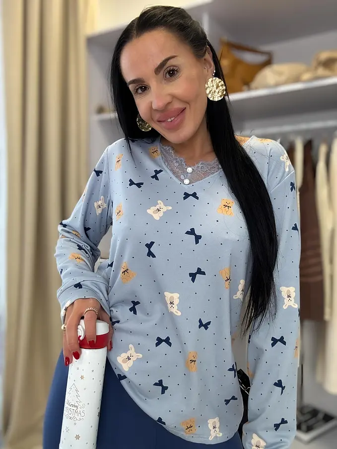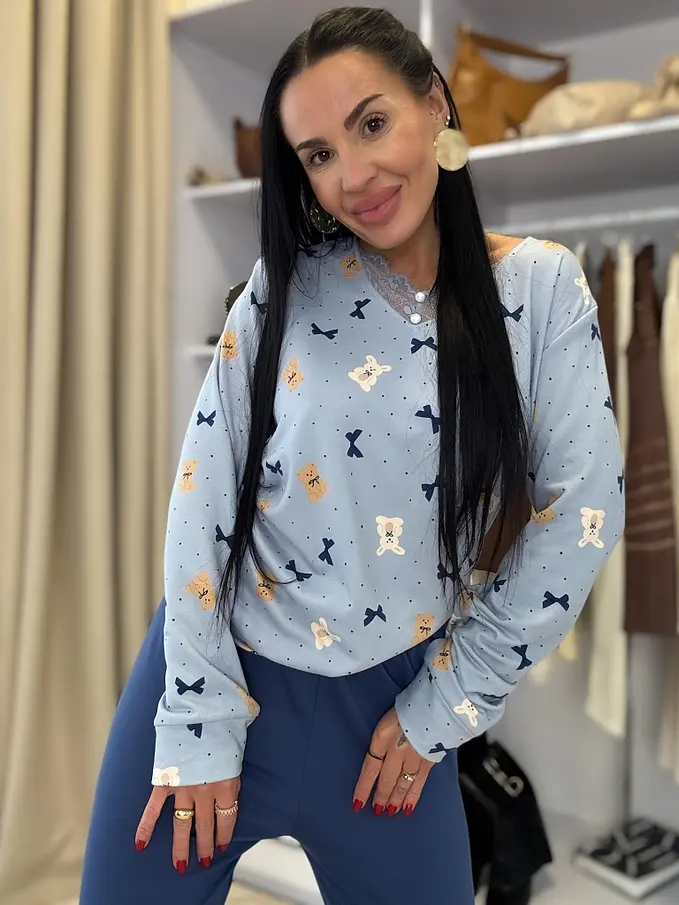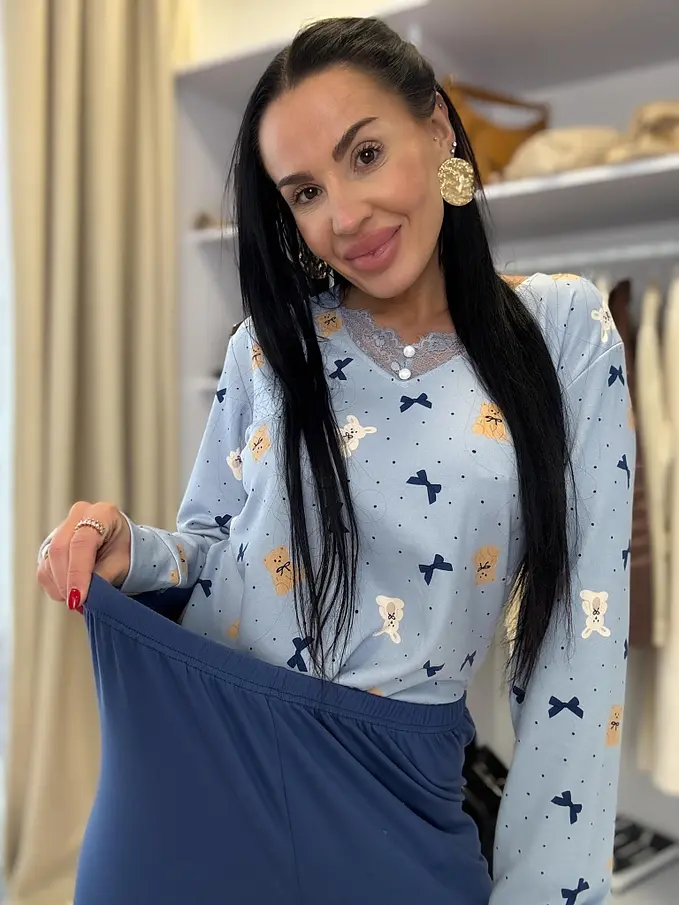 Puha meleg pizsama. A nadrág gumis derekú. A felső rész gombos záródással.