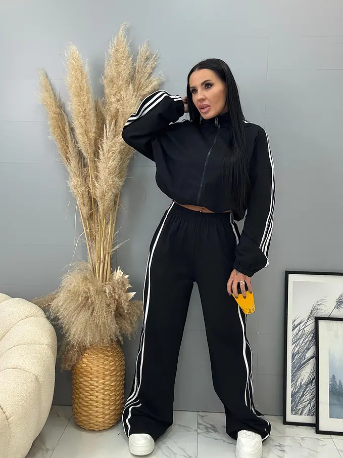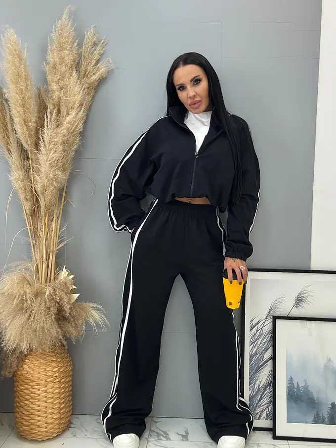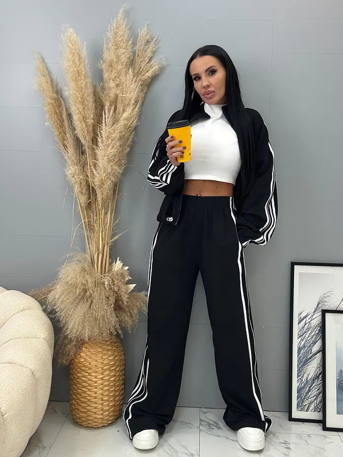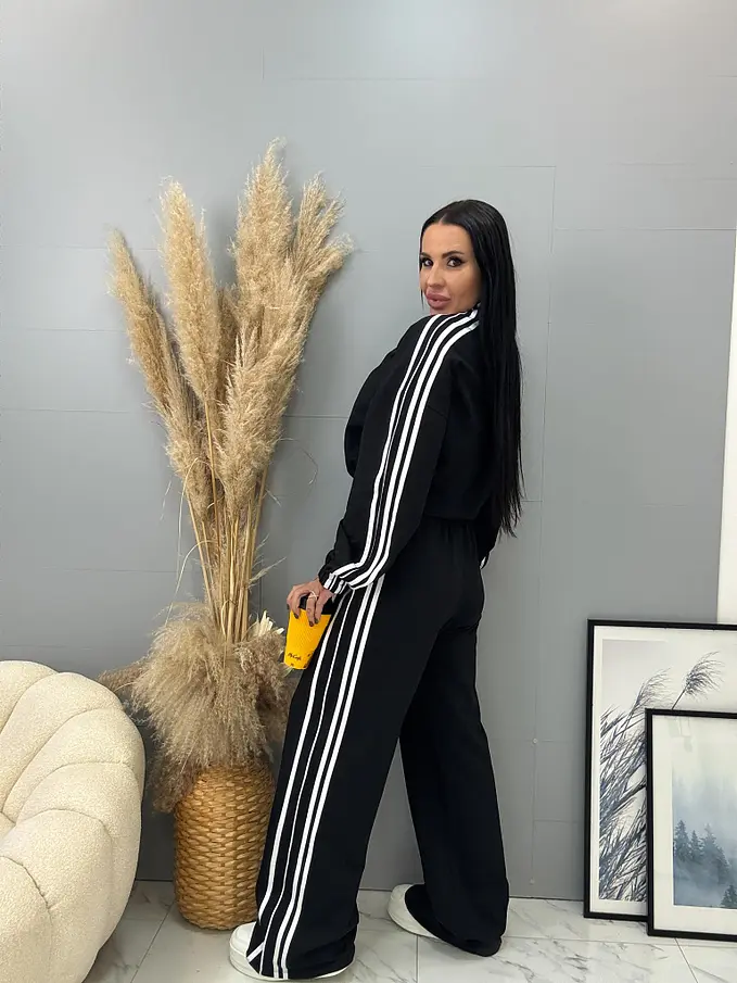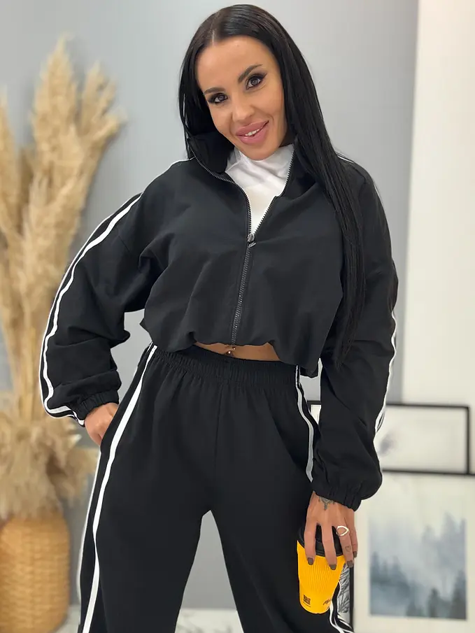 Női sportos együttes a legújabb kollekcióból. Felsőből és gumis derekú nadrágból áll. Anyaga kellemes, elasztikus. A nadrág gumis derekú, oldalsó zsebekkel. A felső cipzáros és alul összehúzható.