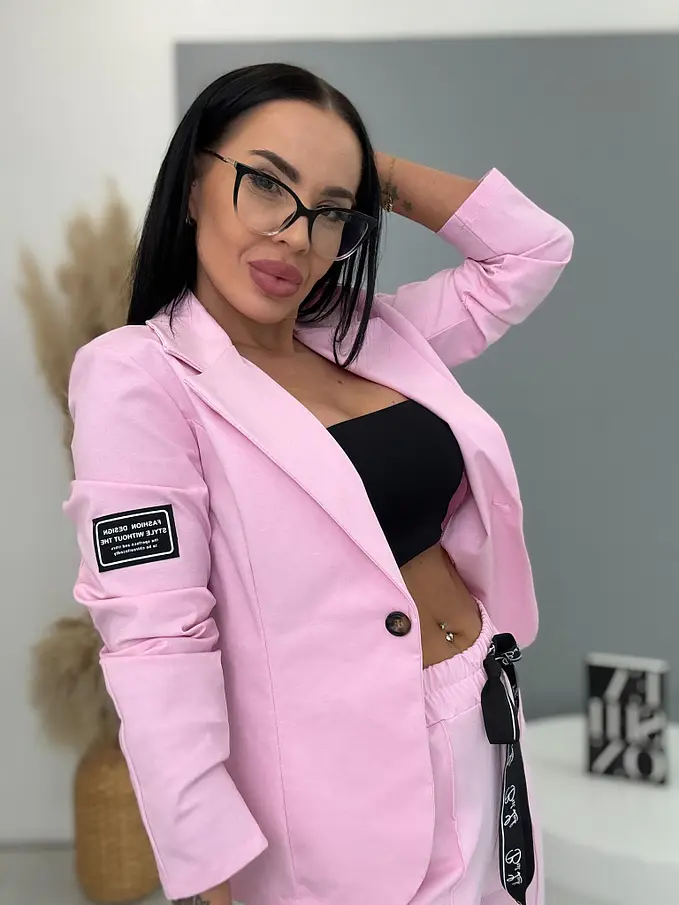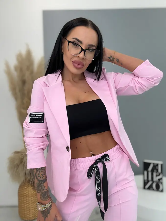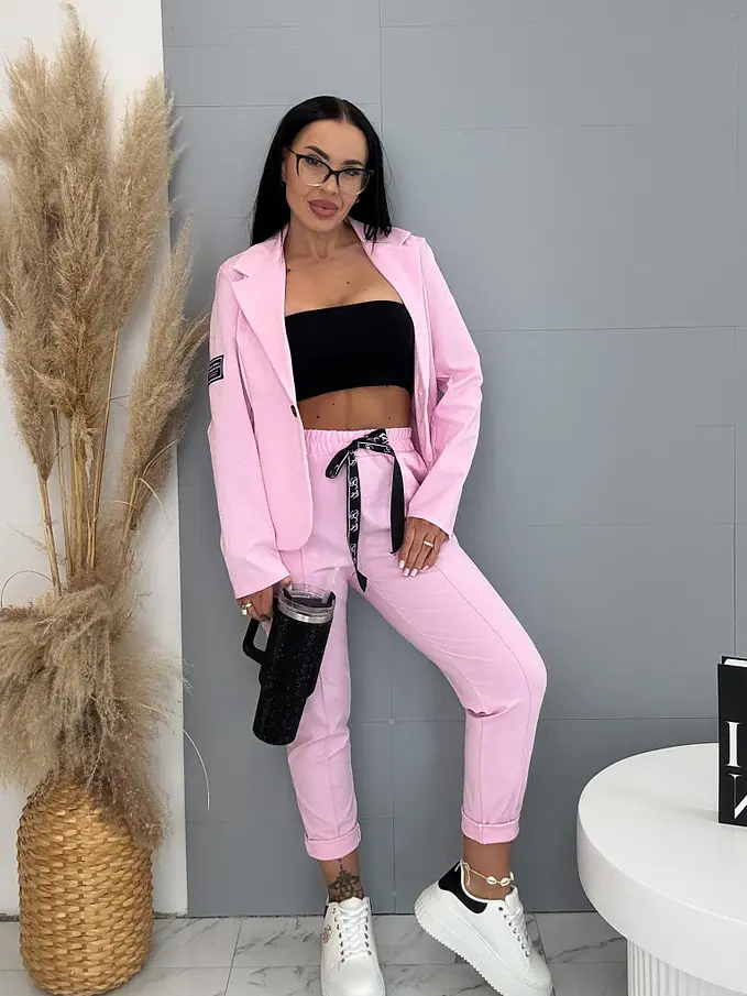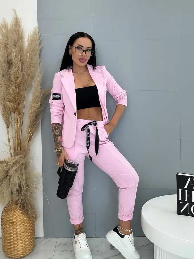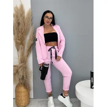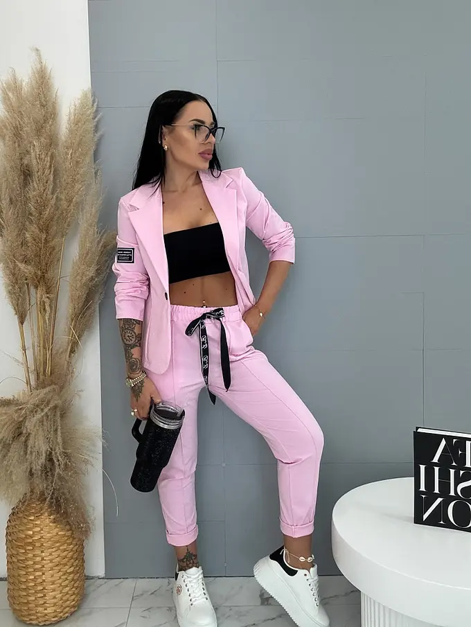 A sportos szett ideális választás a modern nők számára. Zakóból és nadrágból áll. Az anyaga kellemes és rugalmas. A könnyű zakó gombbal záródik. A nadrág oldalzsebekkel és gumis derékkal.