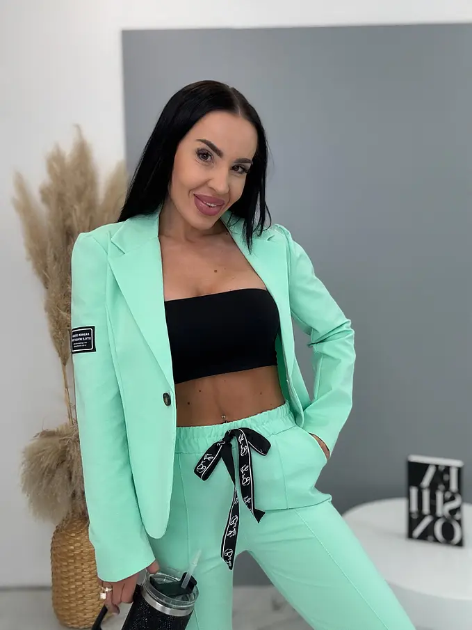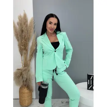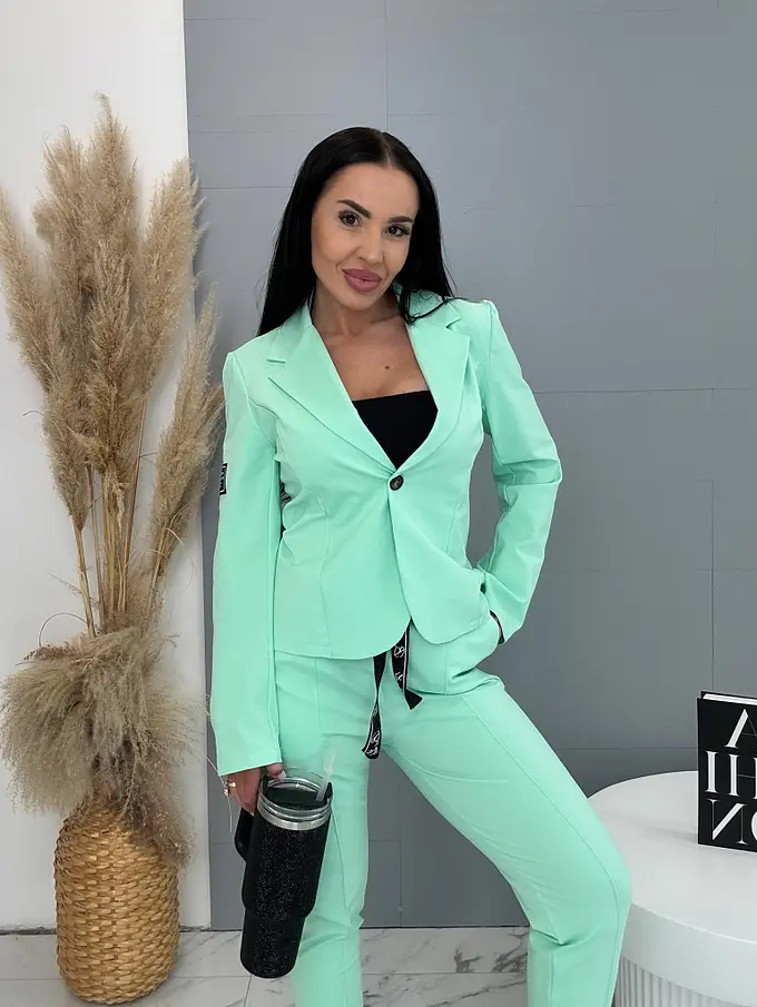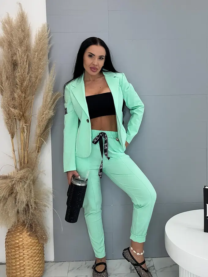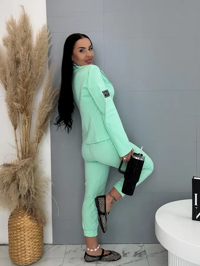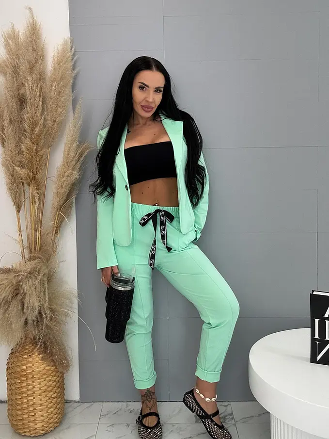 A sportos szett ideális választás a modern nők számára. Zakóból és nadrágból áll. Az anyaga kellemes és rugalmas. A könnyű zakó gombbal záródik. A nadrág oldalzsebekkel és gumis derékkal.