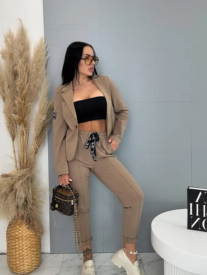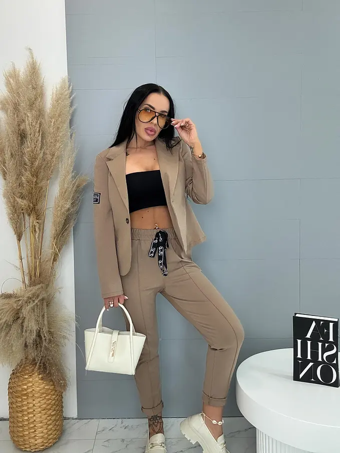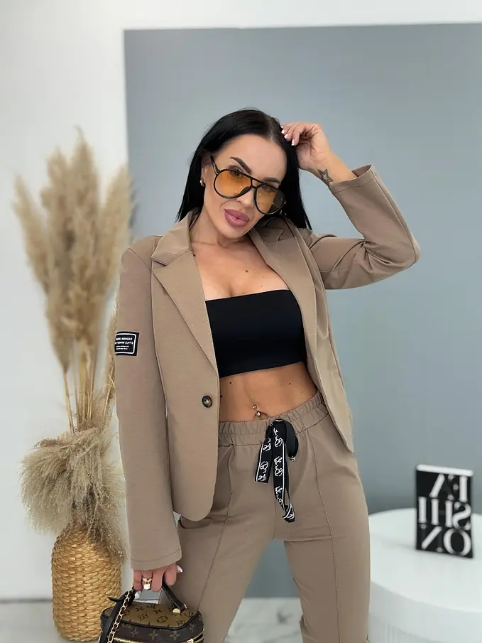 A sportos szett ideális választás a modern nők számára. Zakóból és nadrágból áll. Az anyaga kellemes és rugalmas. A könnyű zakó gombbal záródik. A nadrág oldalzsebekkel és gumis derékkal.