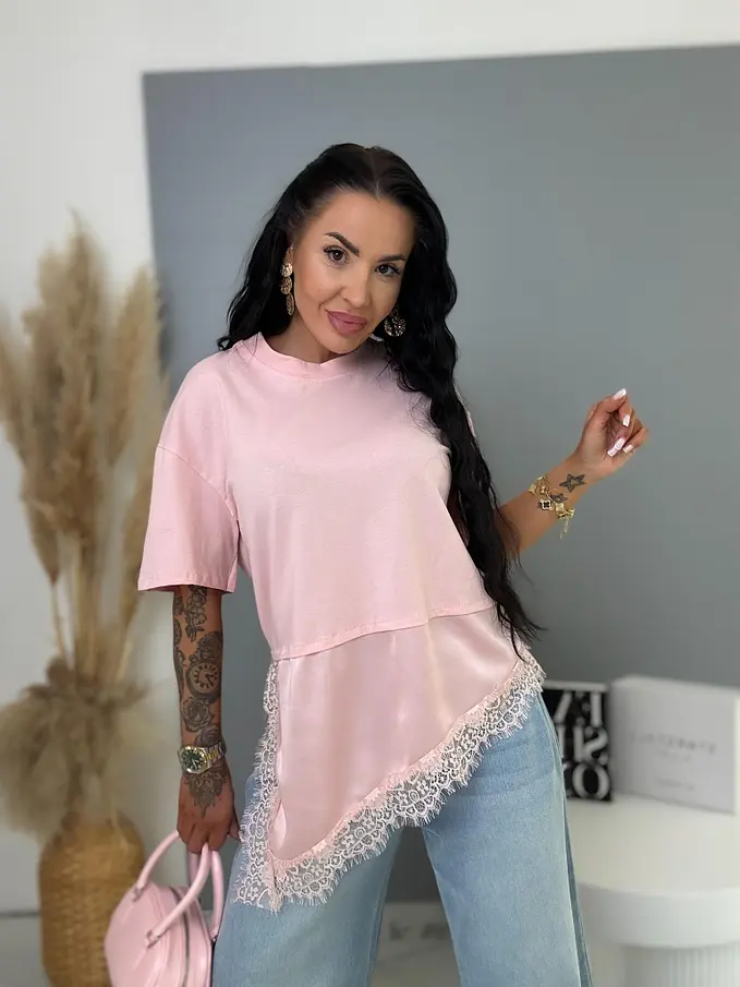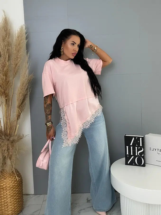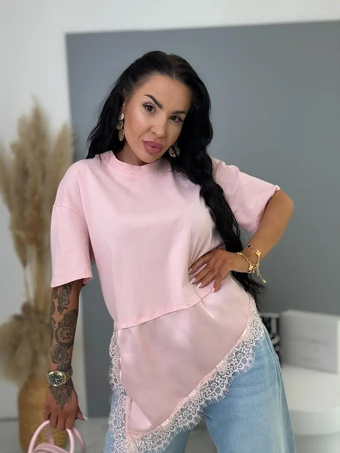 Prémium minőség. A póló kellemes, rugalmas anyagból készült, laza, aszimmetrikus szabással. Az alsó szegély csipkés díszítéssel.