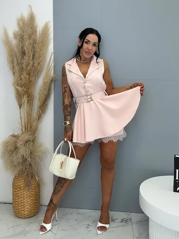Stílusos és kényelmes overál, amely ideális választás a nyári napokra. Az öv szépen kiemeli a derekat, az alsó részen található csipkedíszítés nőies és elegáns megjelenést kölcsönöz. Az elöl gombos kialakítás praktikus és divatos egyszerre. Könnyű anyagának köszönhetően egész napos viseletre is tökéletes.