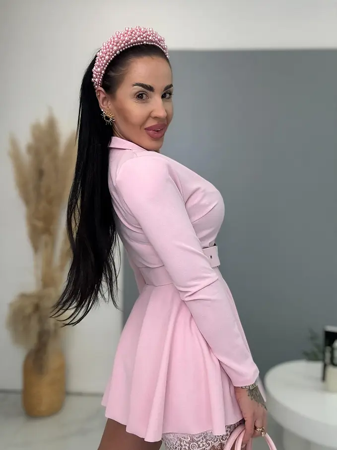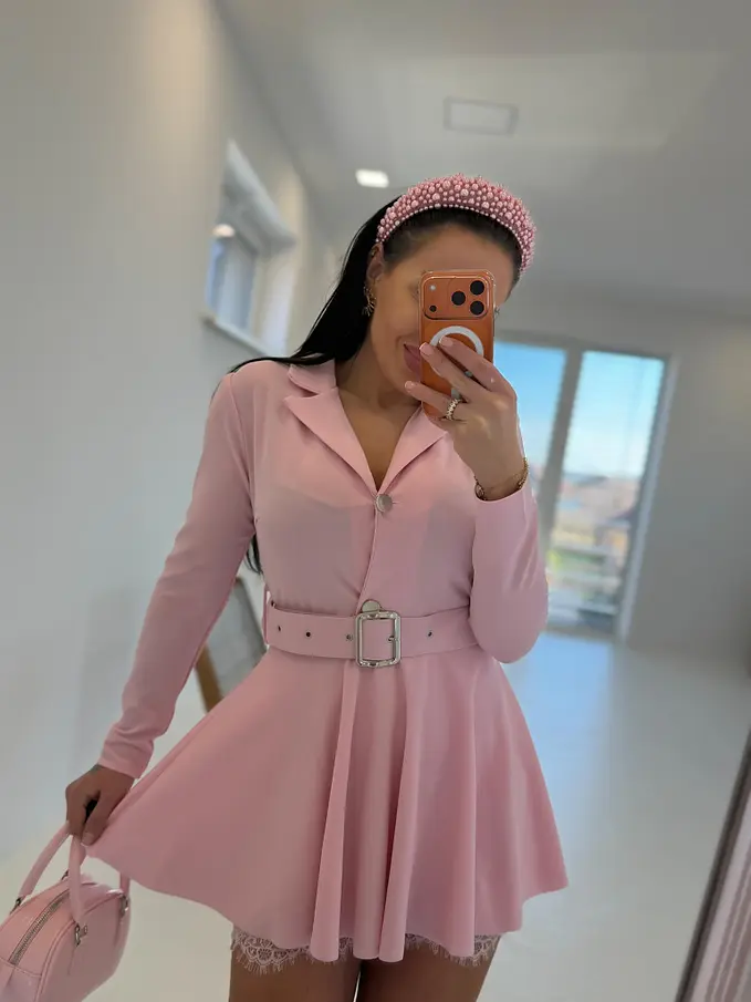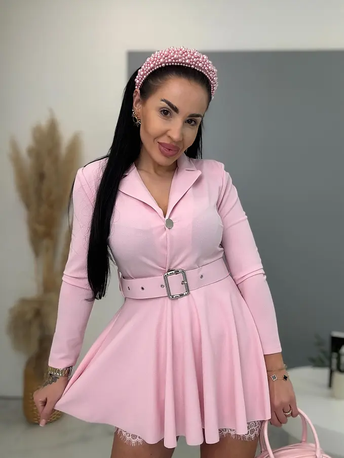 Az overál kellemes elasztikus anyagból készült. Csipkével díszített, hozzá passzoló övvel.