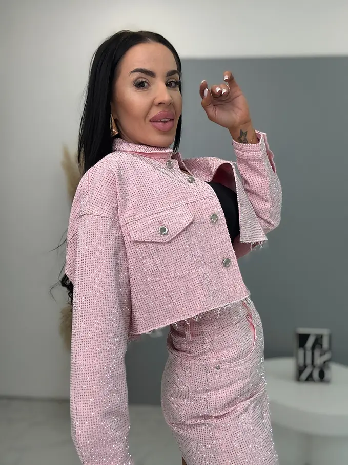 Pink crop denim kabát strasszkövekkel CRYSTAL