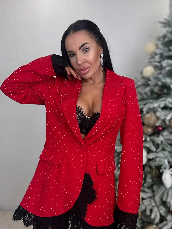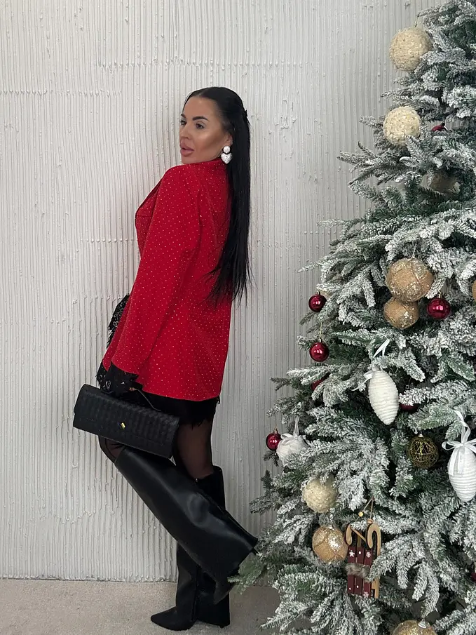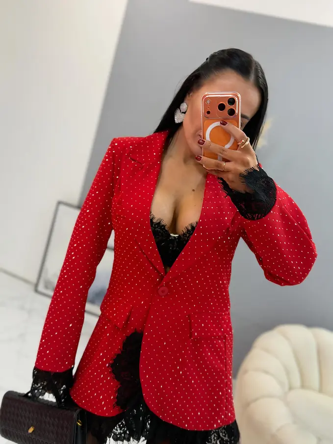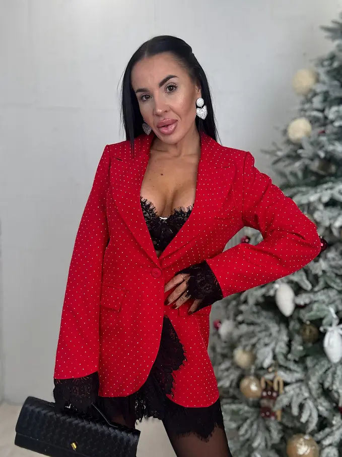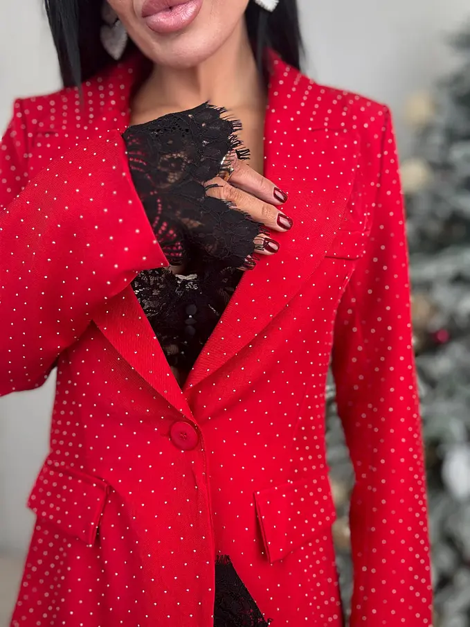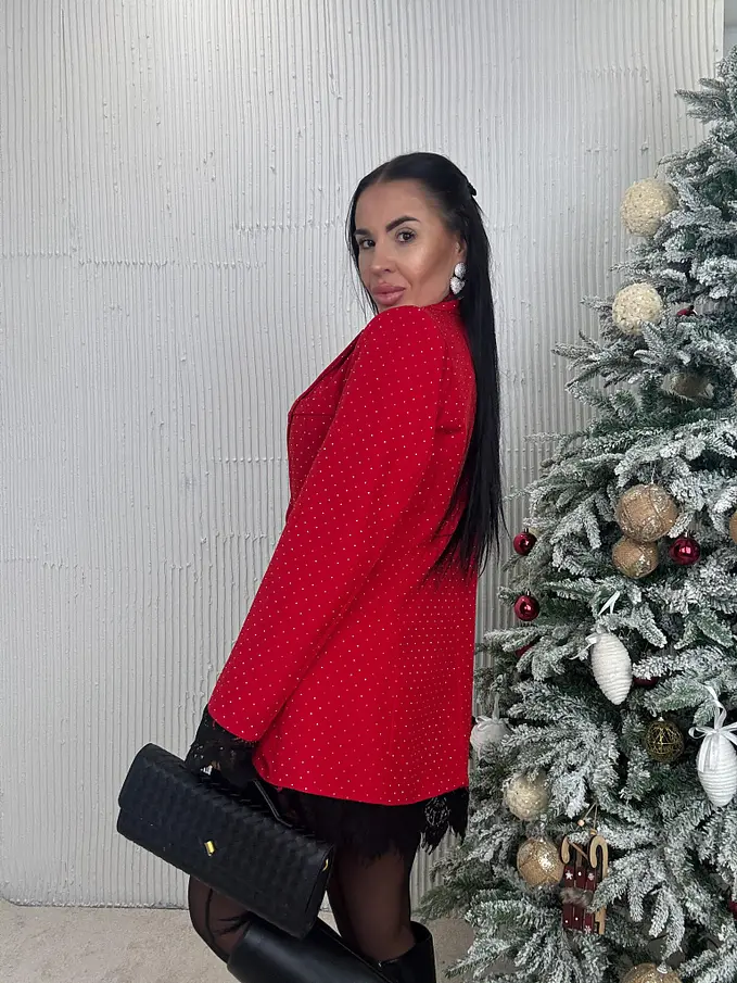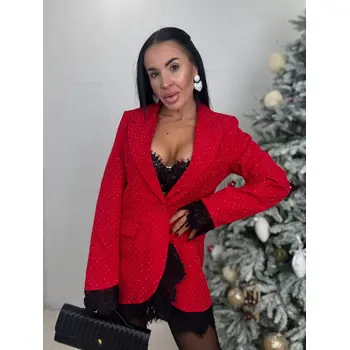 Női blézer kellemes anyagból. Az anyag nem rugalmas. A blézer gombbal záródik. Vállrésznél válltöméssel rendelkezik. Átlátszó csipkebetétekkel és kövecskékkel díszítve.