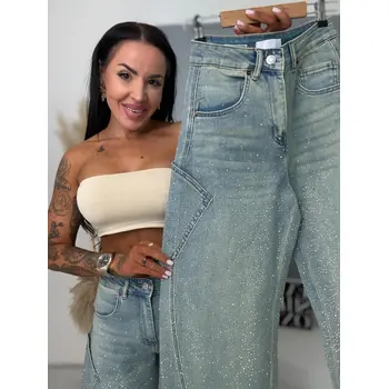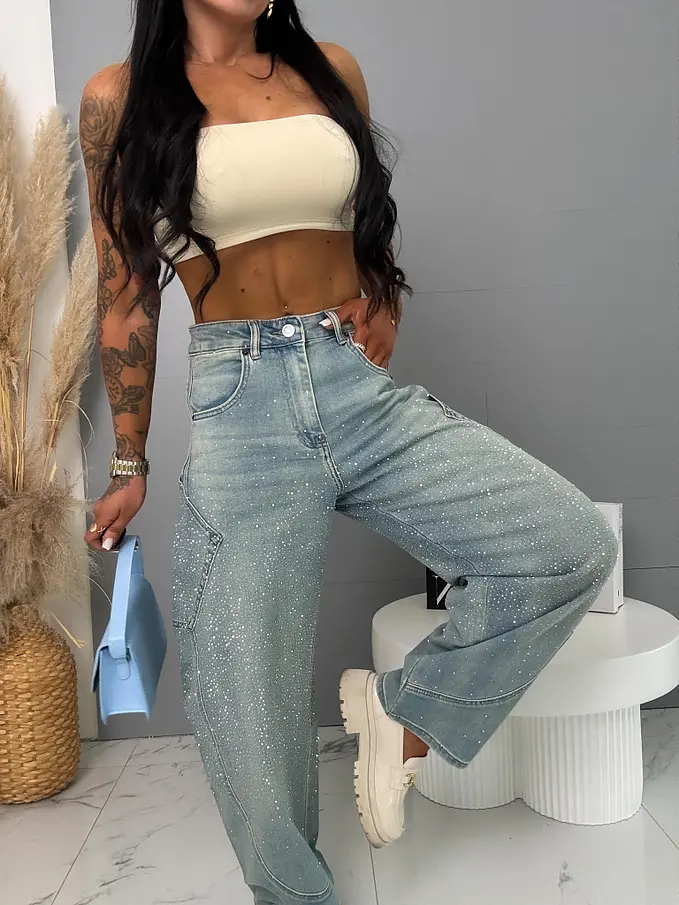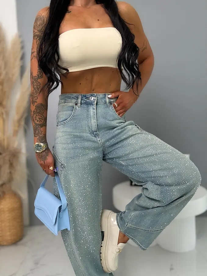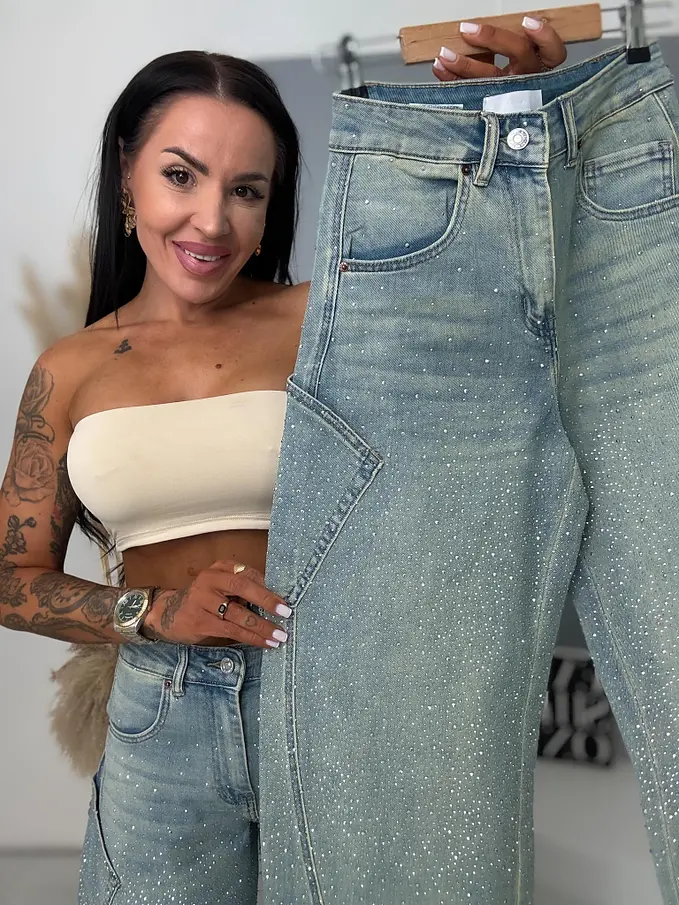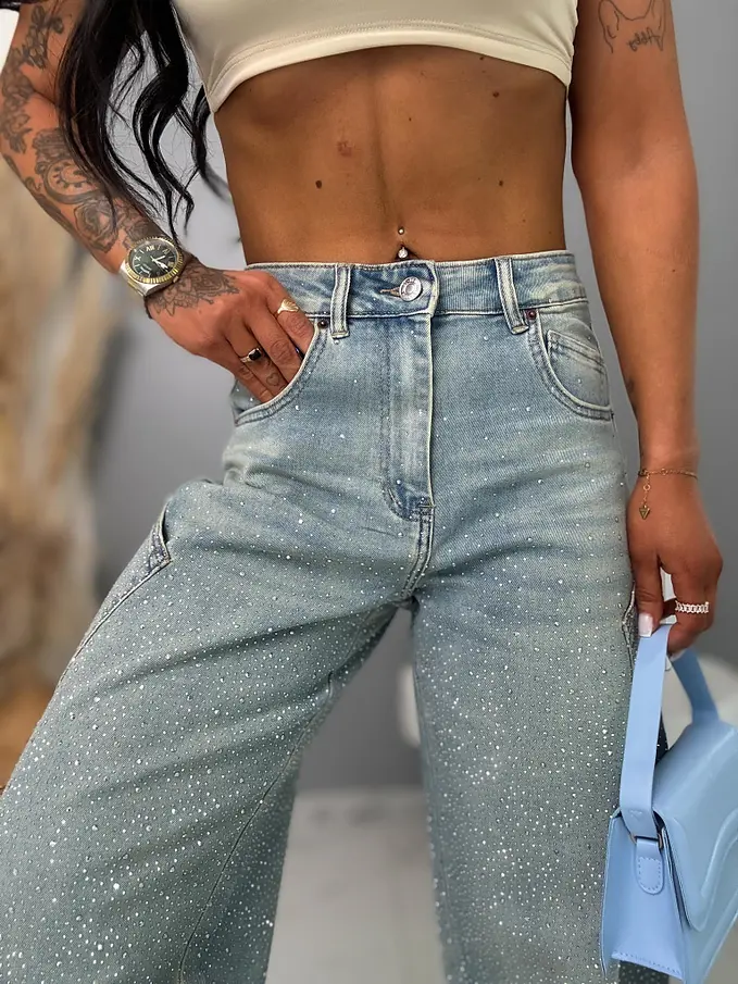 Stílus és elegancia találkozik ebben a magas derekú, prémium minőségű farmernadrágban. Az elöl és hátul elhelyezett finom, csillogó strasszkövek egyedi megjelenést kölcsönöznek, így tökéletes választás mind hétköznapi viselethez, mind elegánsabb összeállításokhoz.