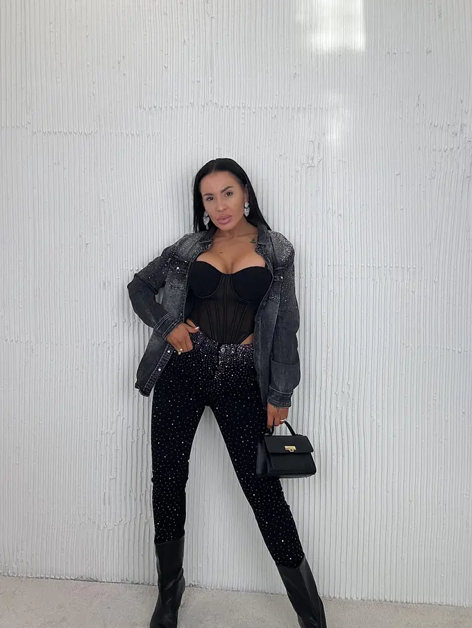 A fekete hajú modell 164 cm magas és 57 kg. S/M méretű felsőt visel.