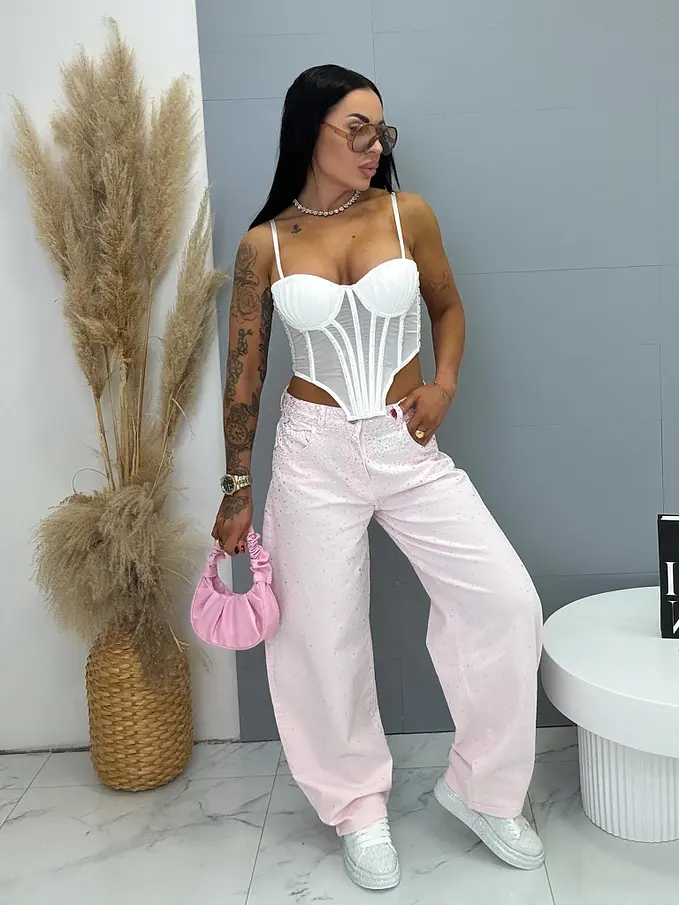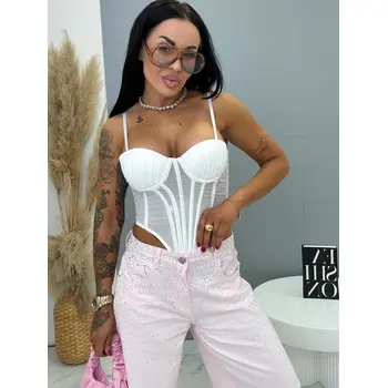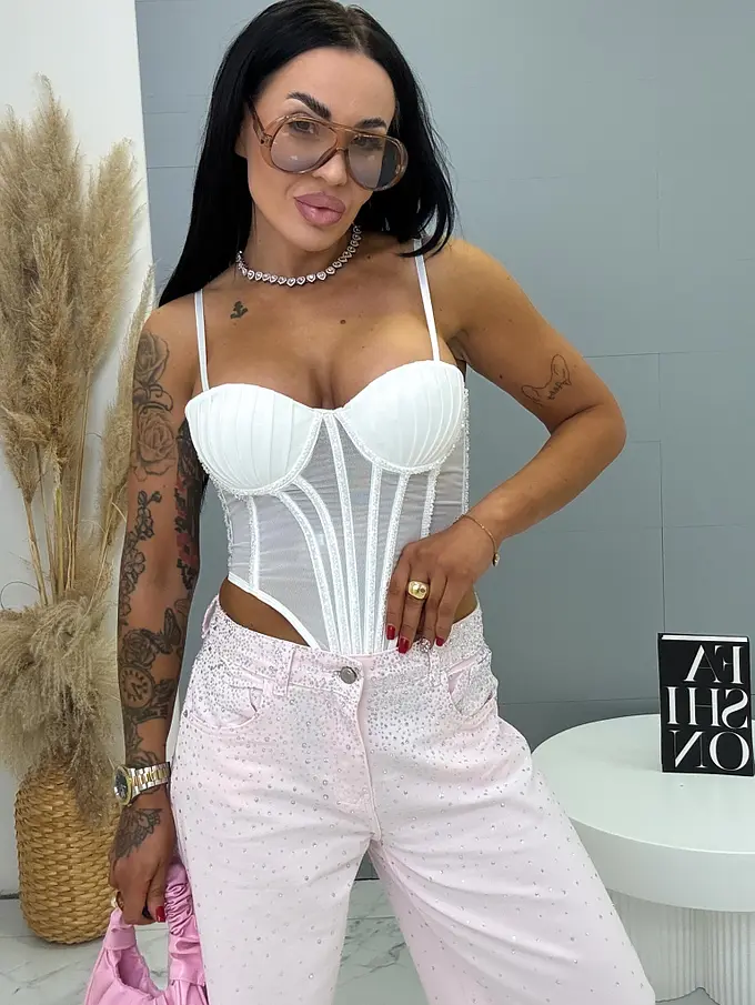 A modell 164 cm magas és 57 kg. S/M méretű korzettet visel.
