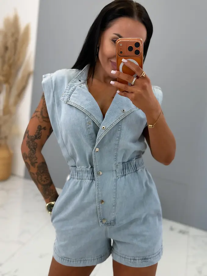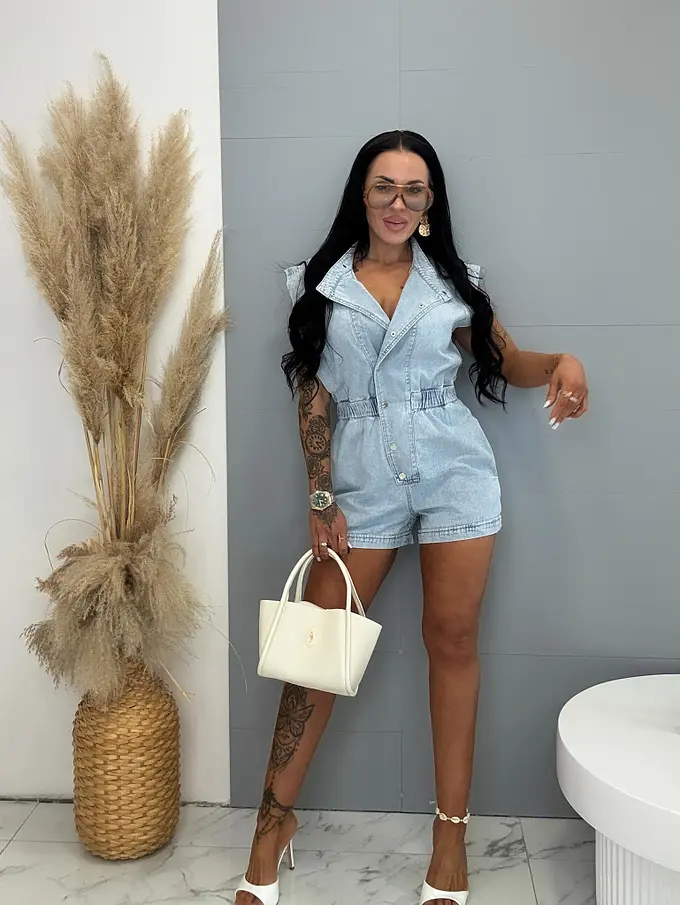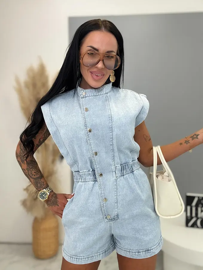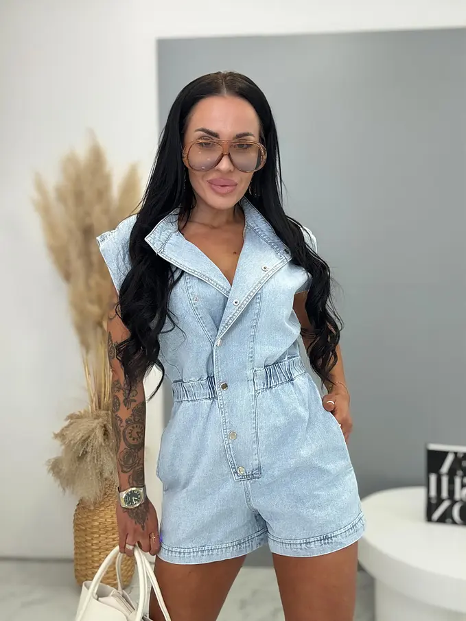 A rövid ujjú, galléros overál modern és egyben praktikus darab, amely minden ruhatárba ideális választás. Az ezüst színű szegecsekkel való záródás kényelmes öltözködést biztosít, és egyben visszafogott dizájnelemet ad a modellnek. Az oldalzsebek növelik a viselési komfortot.