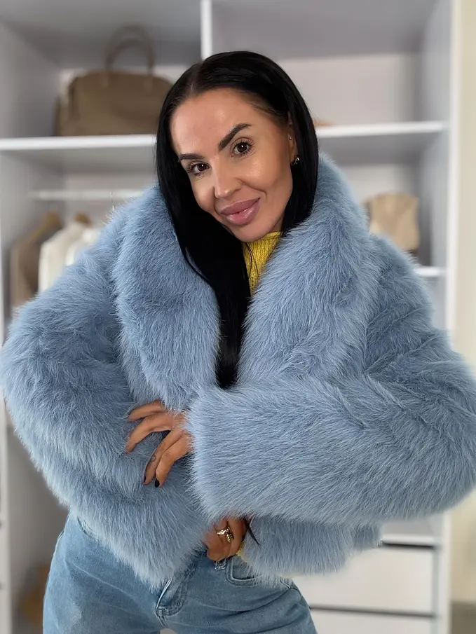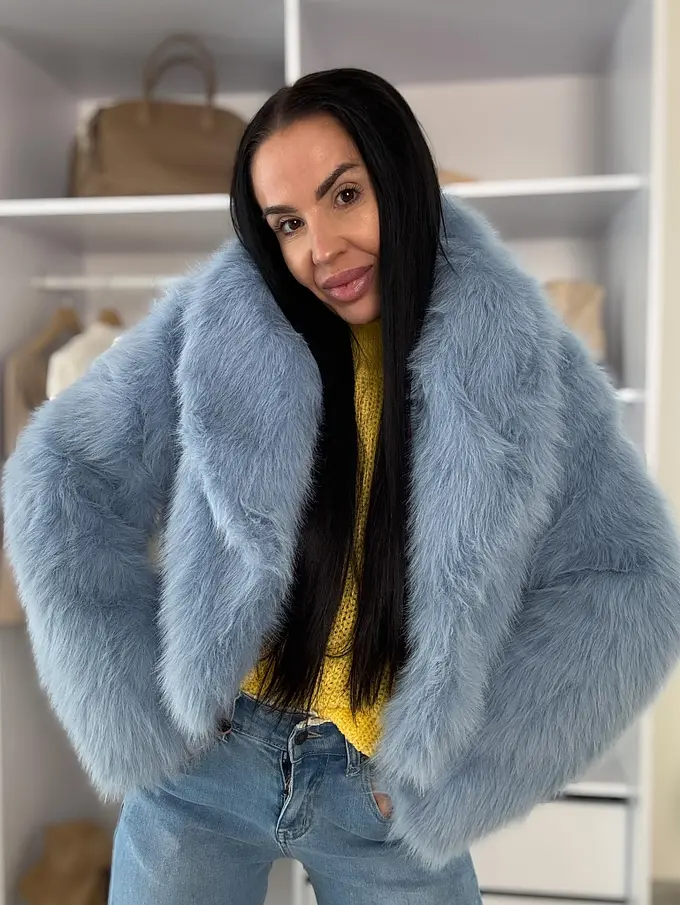 A fekete hajú modell 164 cm magas és 57 kg. S/M méretű kabátot visel.