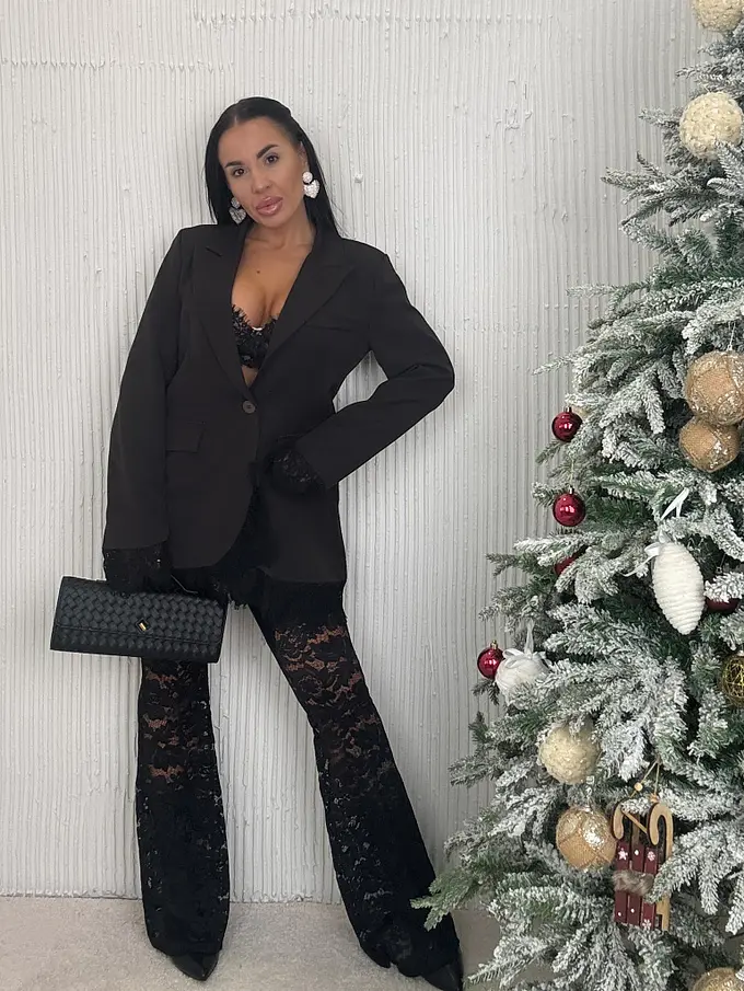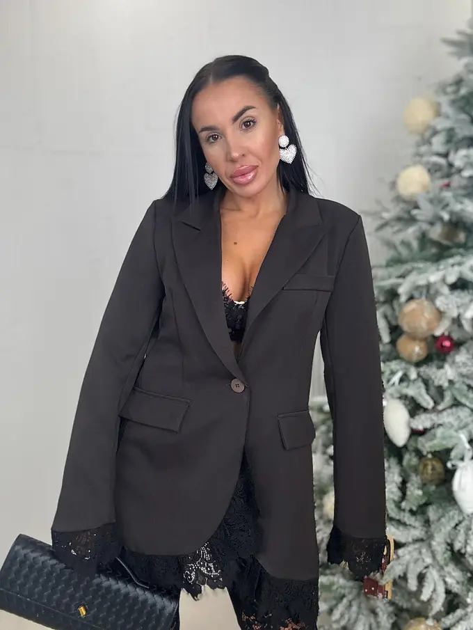 Női blézer kellemes anyagból. Az anyag nem rugalmas. A blézer gombbal záródik. Vállrésznél válltöméssel rendelkezik. Átlátszó csipkebetétekkel.