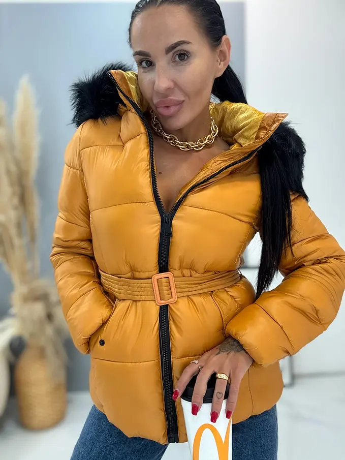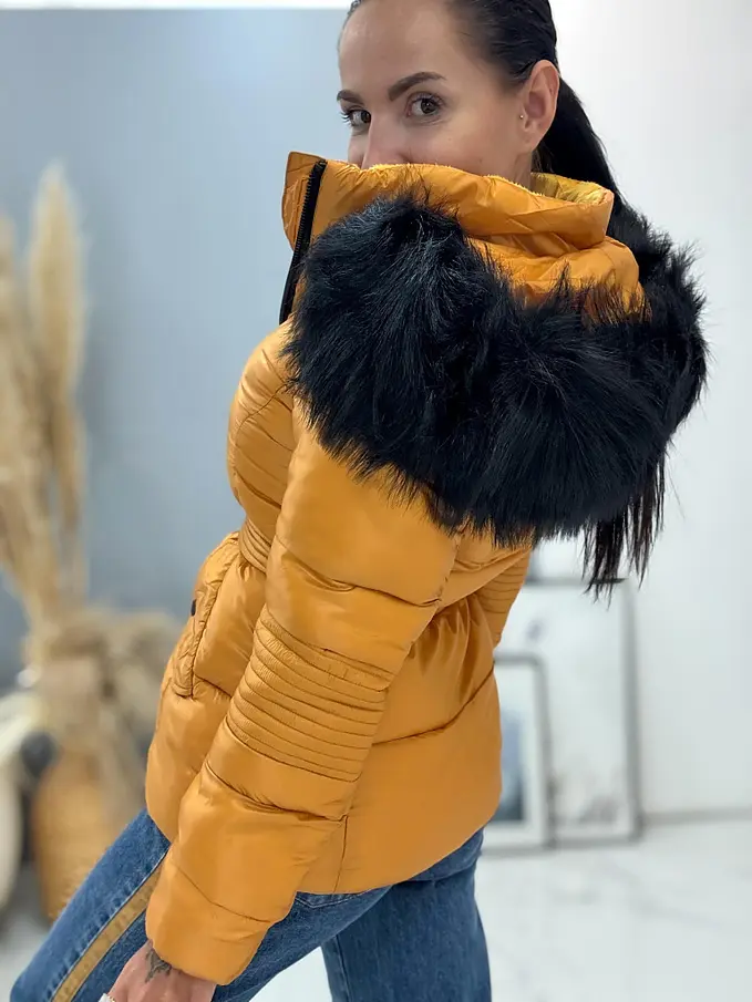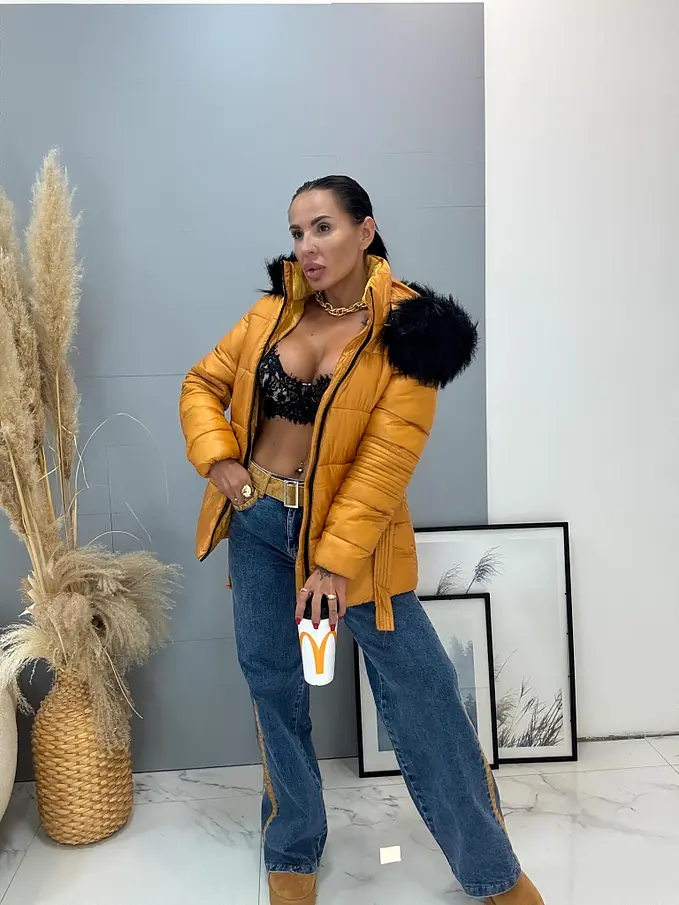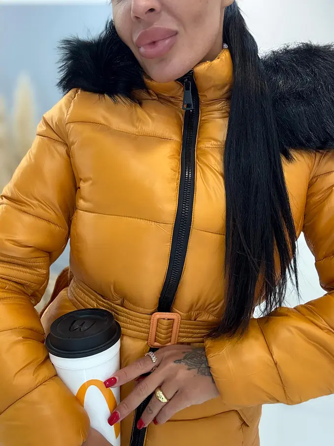 Női kabát, melyben biztosan feltűnő leszel!. Anyaga nem elasztikus. A kapucni nem levehető, a szőrme igen.