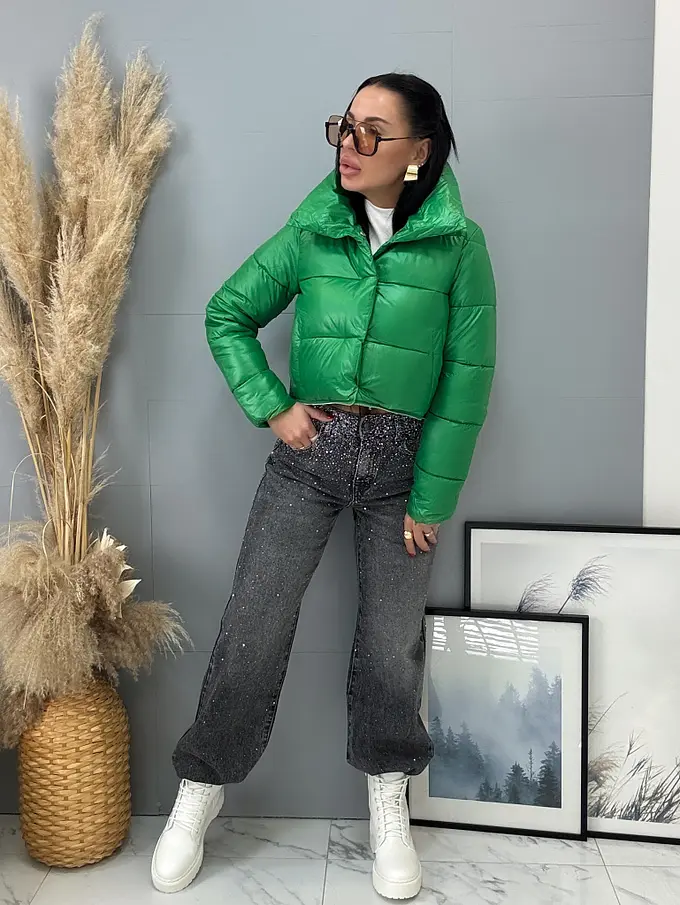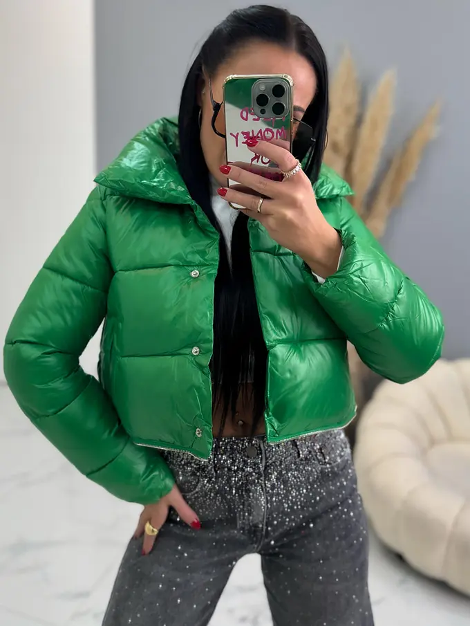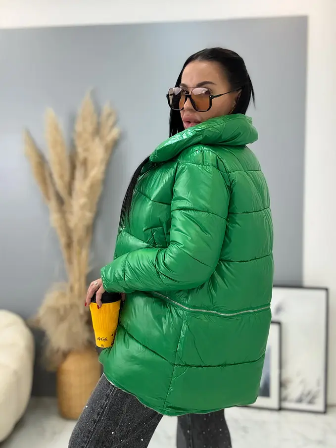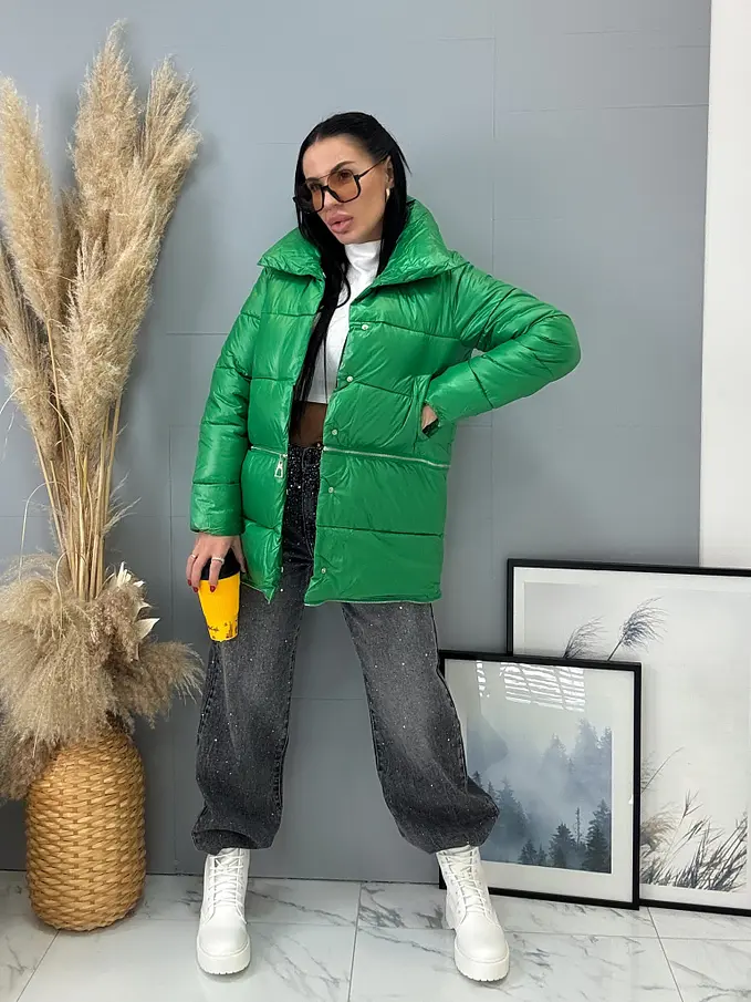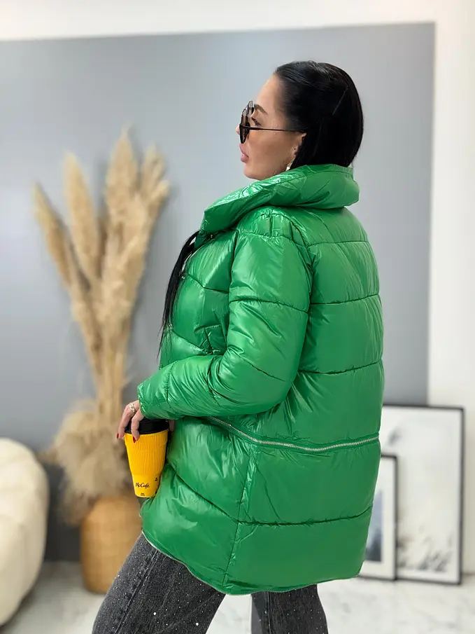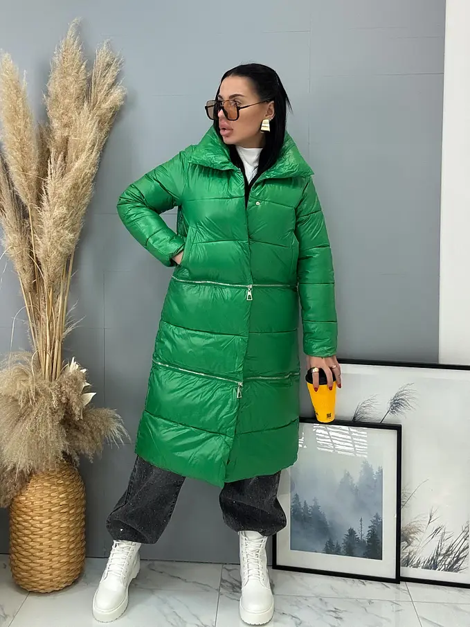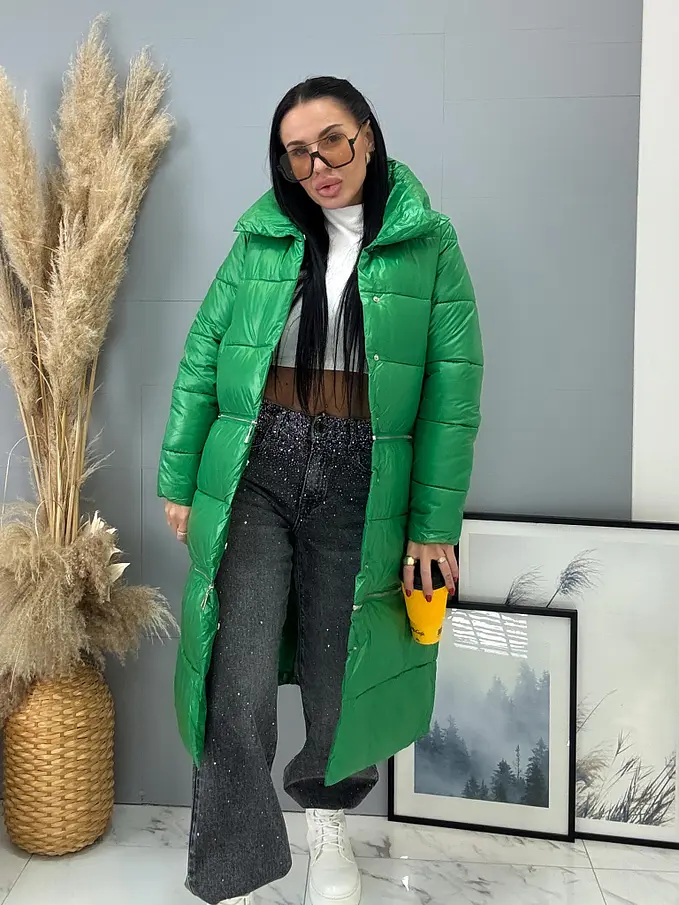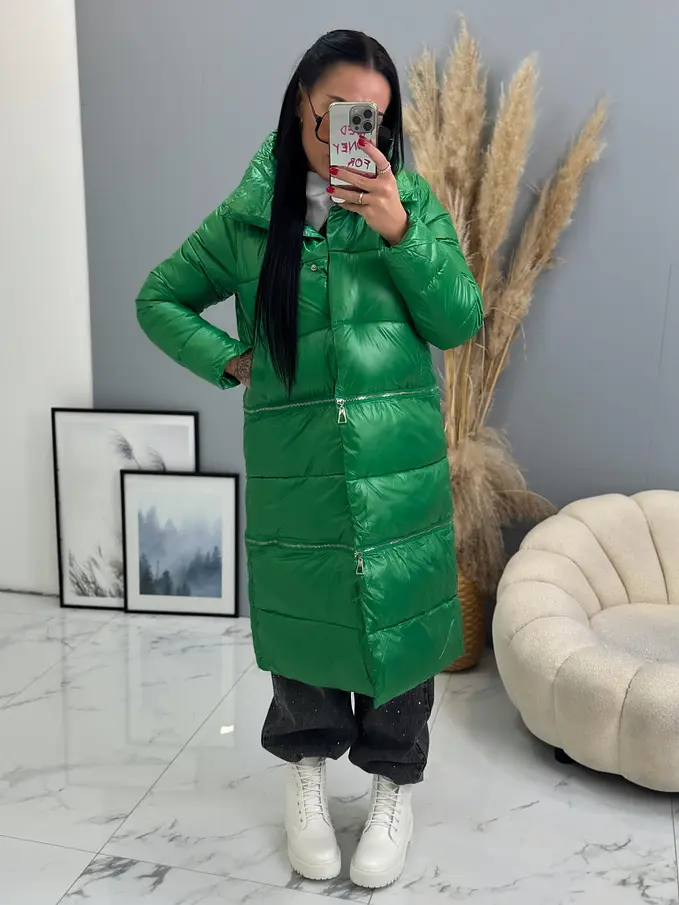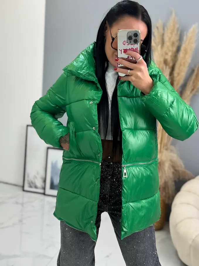 Steppelt, meleg kabát állítható hosszúsággal. Oldalsó zsebekkel. Ezüstszínű cipzárral.