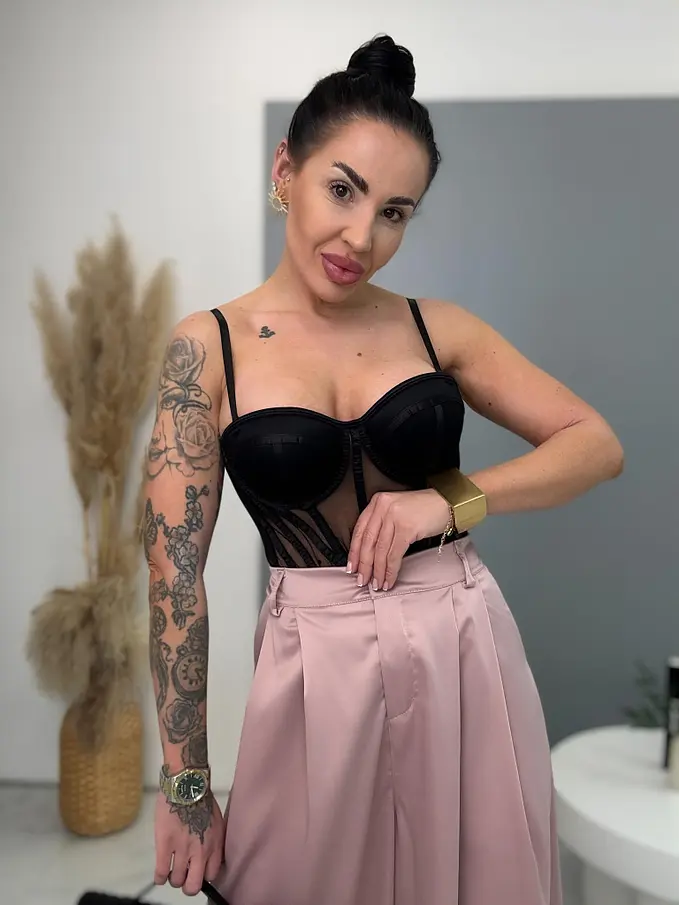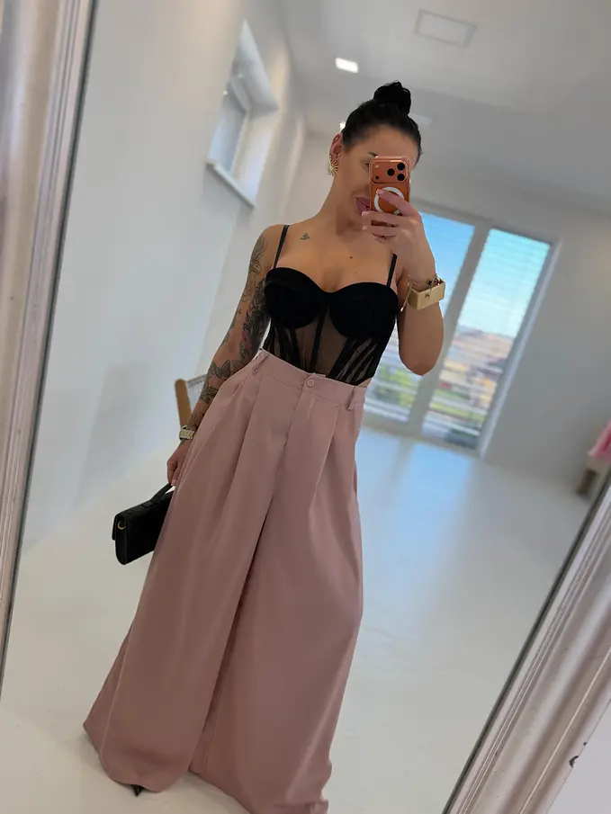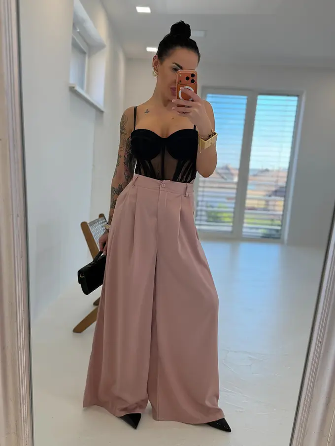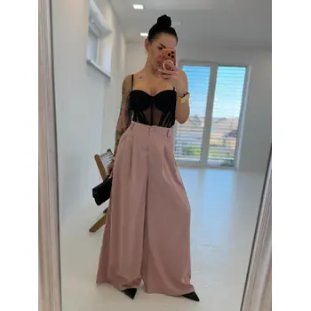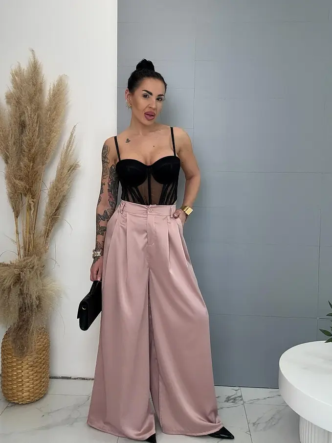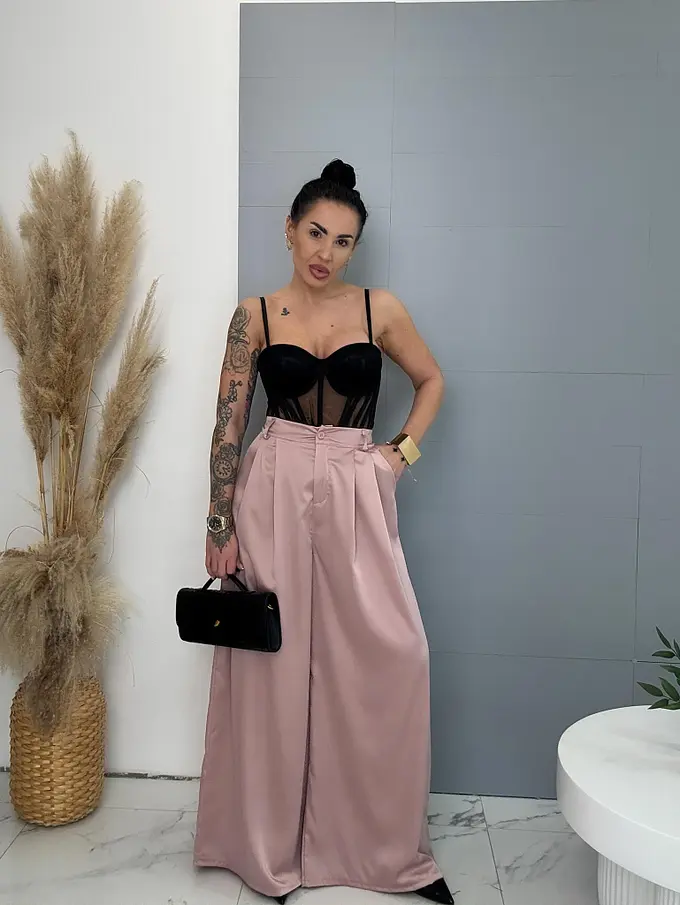 Könnyű, minőségi szatén anyagból készült nadrág. Széles szabású modell, bő szárakkal és magas derékkal. Gumis derékrésszel és oldalzsebekkel.