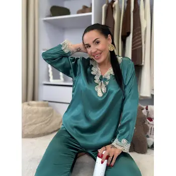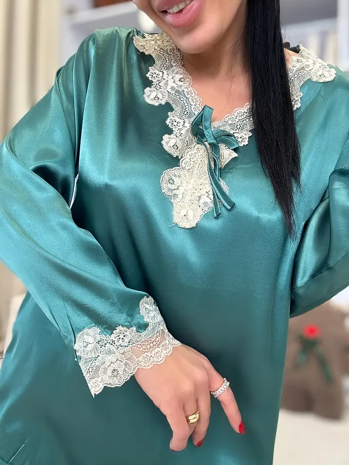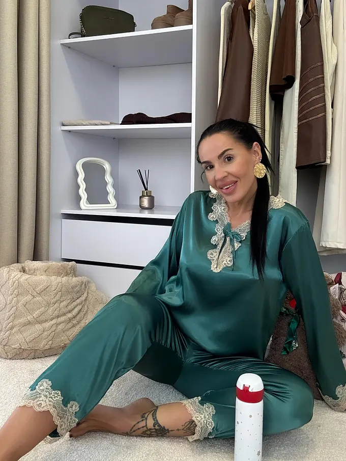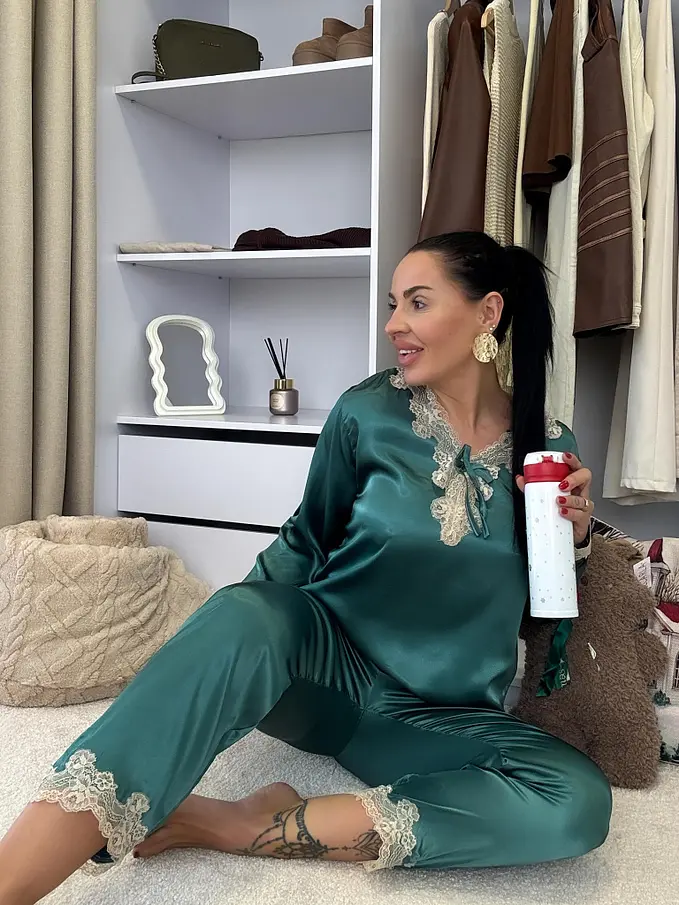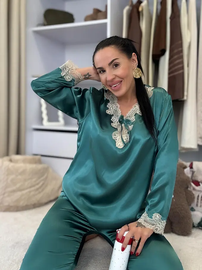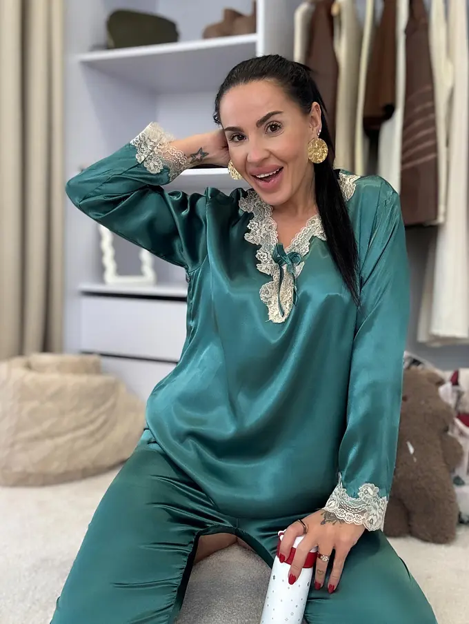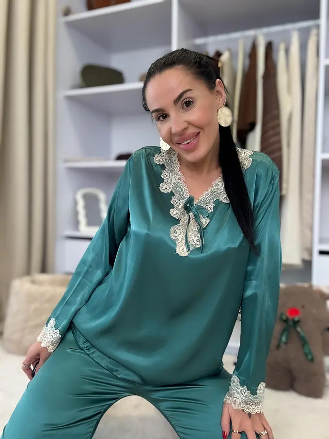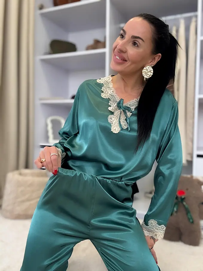 Szatén pizsama csipkeszegéllyel. Anyaga nem elasztikus. A nadrág gumis derekú. Felső rész csipkével díszített.