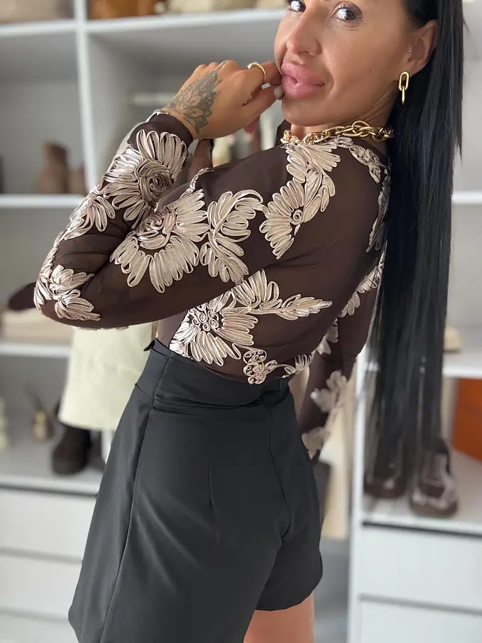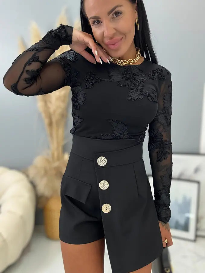 Kényelmes és divatos szoknyanadrág. Anyaga kellemes, nem elasztikus. A díszítés arany színű. Hátul cipzárral záródik.