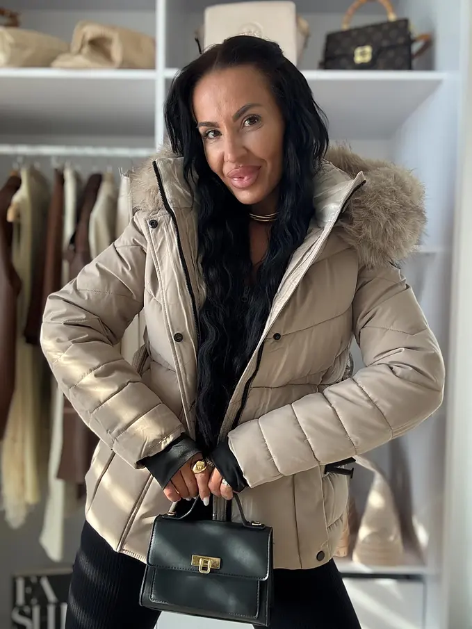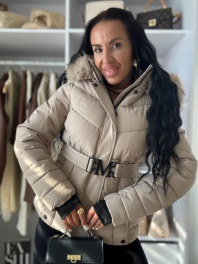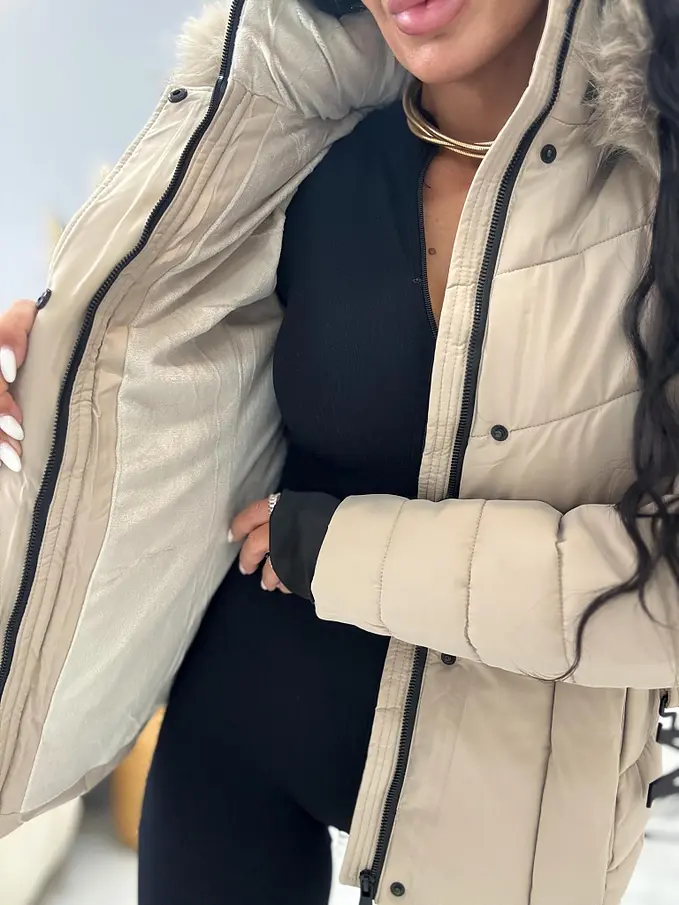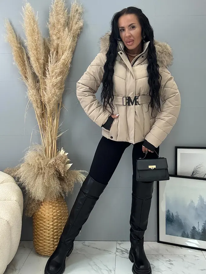 Kabát levehető szőrmés díszítéssel a kapucnin. Elején zsebekkel. Fekete színű cipzárral és díszítéssel. Levehető kapucnival és övvel.